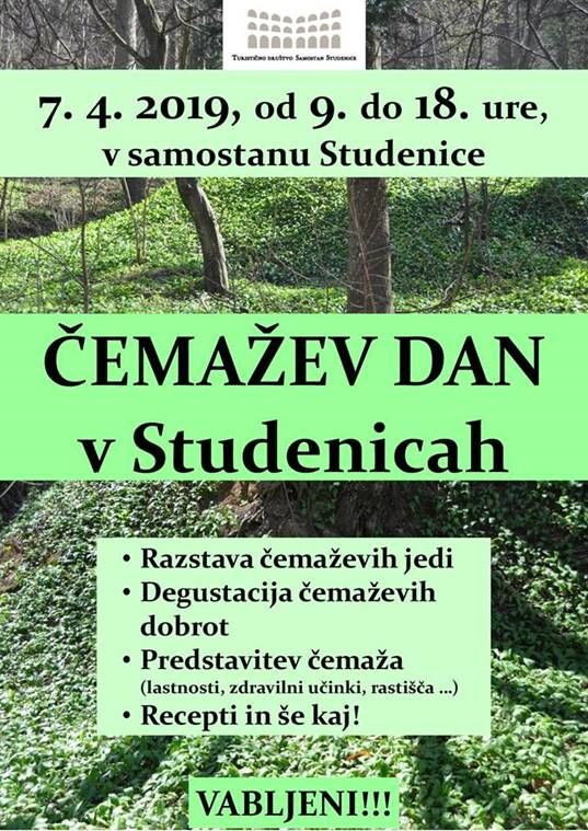 Turistično društvo Samostan Studenice vabi v nedeljo, 7. 4. 2019 od 9. do 18. ure na Čemažev dan. Pridite v Studenice, okusite čemaževe dobrote, naučite se kaj novega, sprehodite se po bližnji okolici, poskrbite za svoje zdravje, … Več info na samostan.studenice@gmail.com ali na 040 432 810.