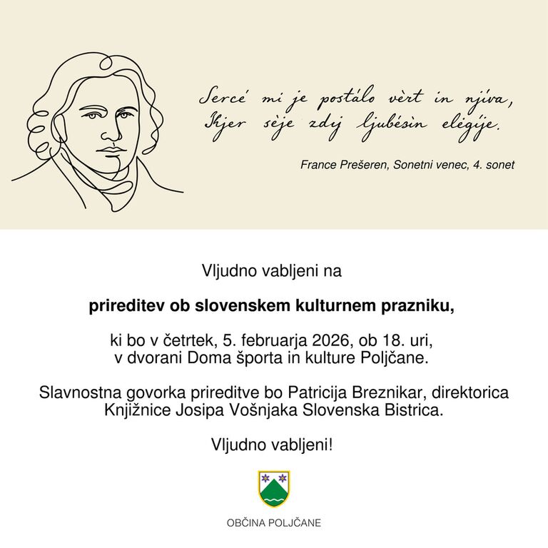 Vljudno vabljeni na prireditev ob slovenskem kulturnem prazniku, ki bo v četrtek, 5. februarja 2026, ob 18. uri, v dvorani Doma športa in kulture Poljčane.