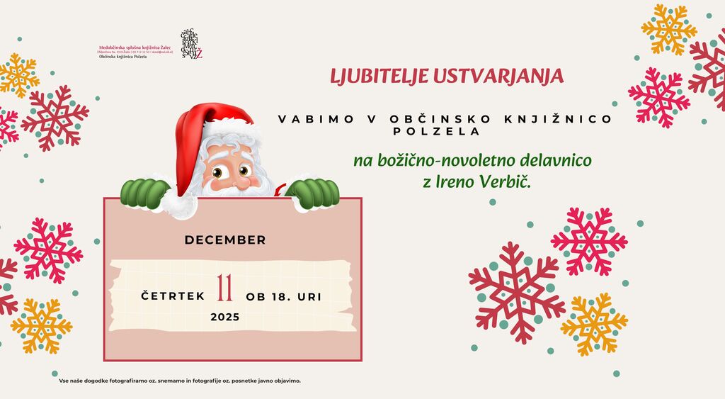 Ljubitelje ustvarjanja prijazno vabimo v Občinsko knjižnico Polzela na praznično obarvano božično-novoletno delavnico, ki jo bo vodila ustvarjalka Irena Verbič.