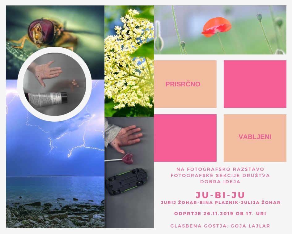 26.11.2019 ob 17. uri - Odprtje razstave fotografij Fotografske sekcije Društva Dobra ideja Bina Vista z naslovom "JU-BI-JU". Avtorji so Jurij, Bina in Julija. Oče, mati in hči se predstavijo vsak s svojo obliko vizualne komunikacije, ki jo izrazijo s fotoaparatom in skenerjem. (Bina 041 69 27 72)
