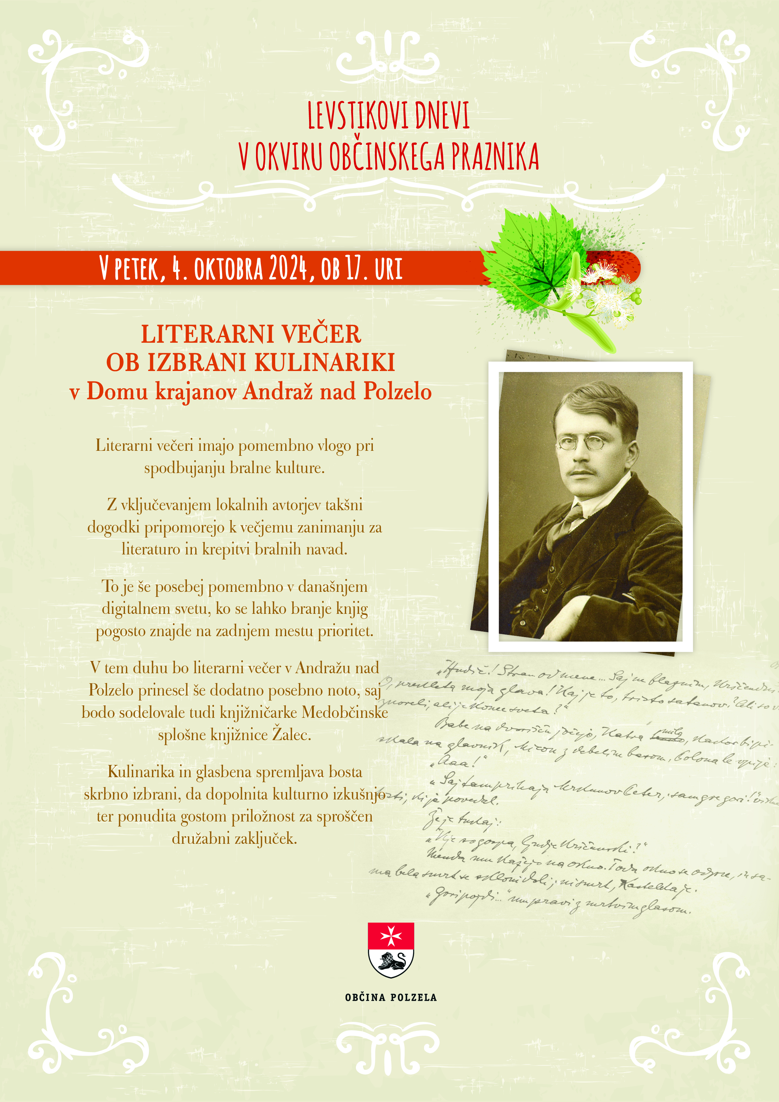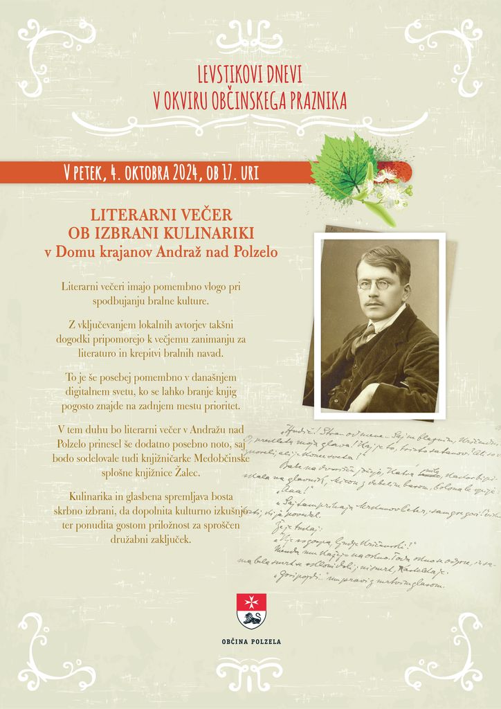 Literarni večer ob izbrani kulinariki bo v petek, 4. oktobra ob 17. uri v Domu krajanov Andraž nad Polzelo.