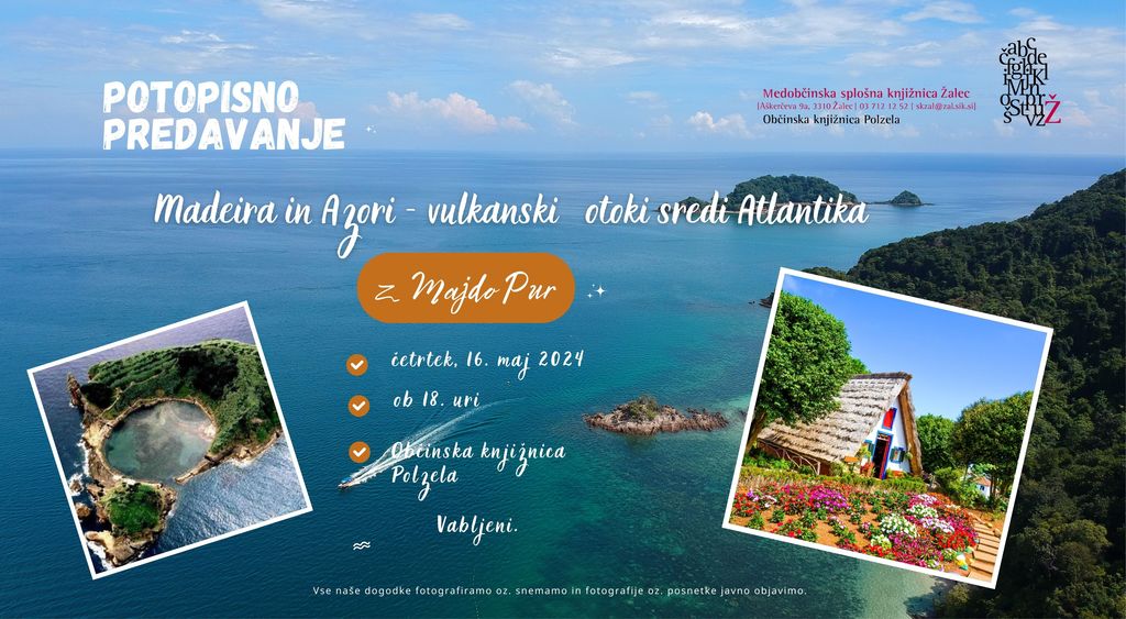 vabljeni na potopisno predavanje domačinke Majde Pur Madeira in Azori - vulkanski otoki sredi Atlantika, ki bo v četrtek, 16. maja 2024, ob 18. uri v Občinski knjižnici Polzela.