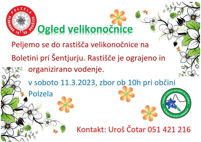 OPIS POTI:Peljemo se do rastišča Velikonočnice na Boletini pri Šentjurju. (Izvoz Dramlje, smer Šentjur, rondo levo proti Ponikvi in še naprej do rastišča). Rastišče Velikonočnice je odprto, ograjeno, organizirano je vodenje.