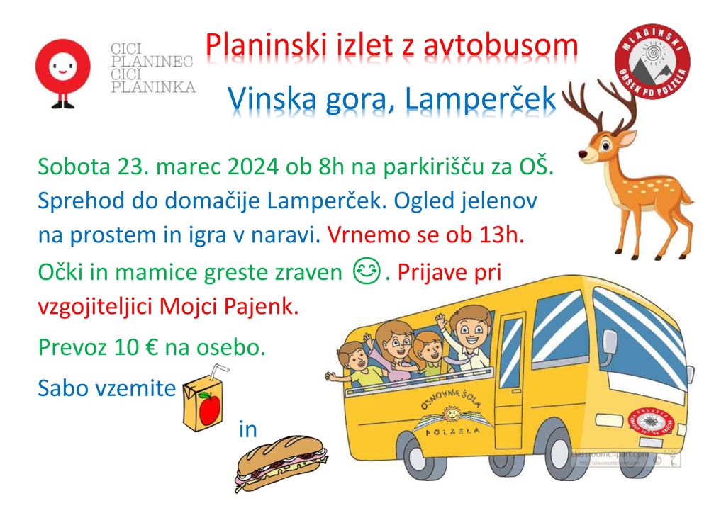 Sobota 23. marec 2024 ob 8h na parkirišču za OŠ. Sprehod do domačije Lamperček. Ogled jelenov na prostem in igra v naravi. Vrnemo se ob 13h. Očki in mamice greste zraven.... lahko tudi dedki in babice. Prijave v vrtcu pri vzgojiteljici Mojci Pajenk. Prevoz 10 € na osebo.