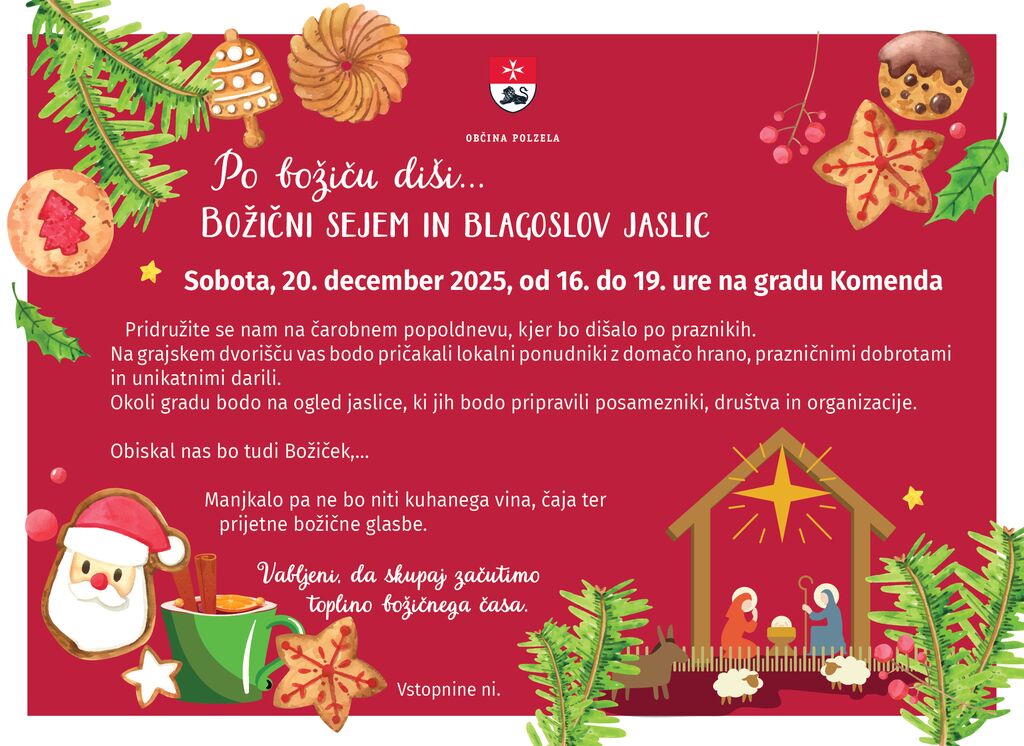 Lepo vabljeni na Božični sejem, kjer se bodo predstavili lokalni ponudniki, z domačimi dobrotami in prazničnimi darili, predstavili in blagoslovili bomo jaslice, katere bodo tokrat predstavljene na gradu Komenda in menda bo prišel tudi Božiček....