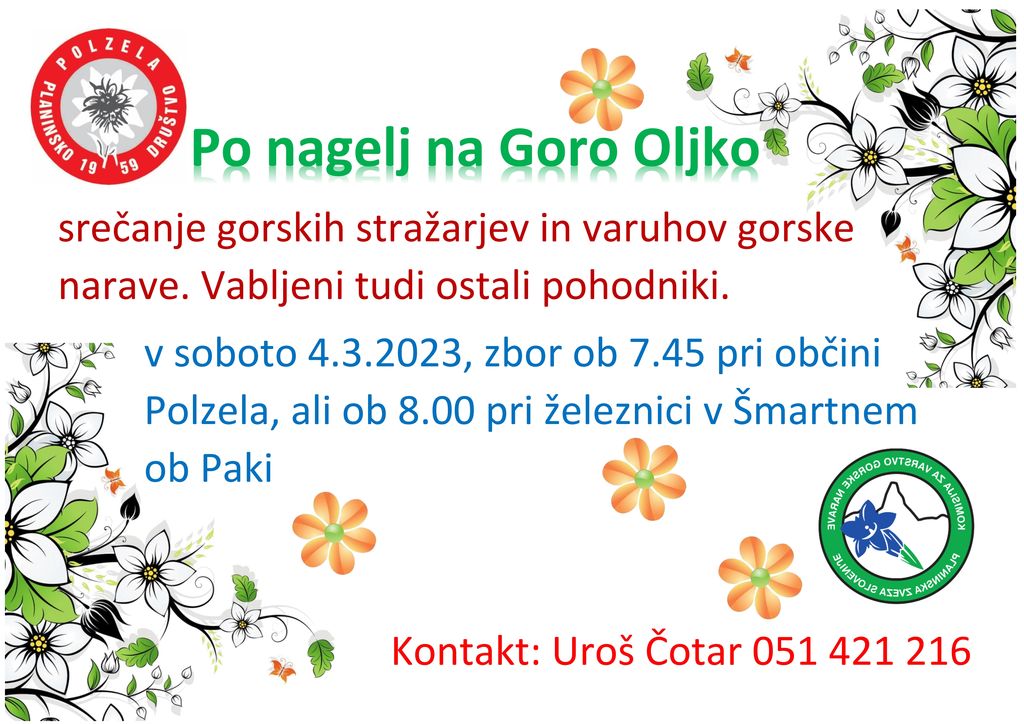PD Polzela - odsek VGN vabi v soboto 4.3. 2022 na 7. tradicionalni pohod »Po nagelj na Goro Oljko« združen s srečanjem gorskih stražarjev in varuhov gorske narave Savinjskega MDO.