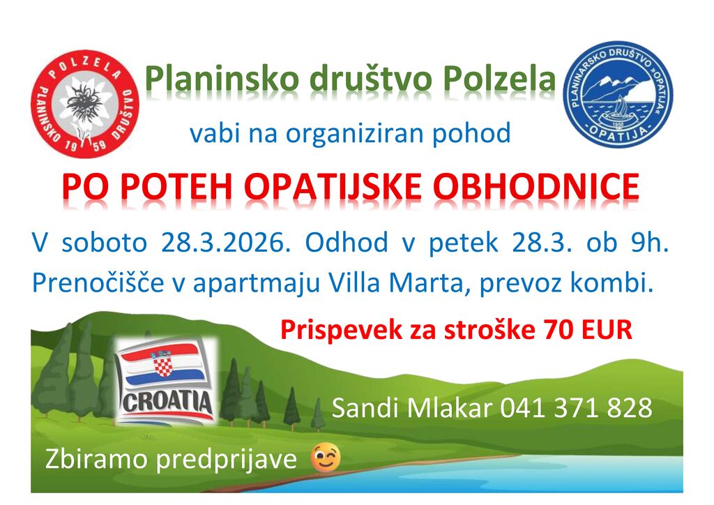 Planinsko društvo Polzela in Planinsko društvo Opatija vabita na tradicionalni pohod po Opatijski planinski obhodnici, ki bo v soboto 28. marca 2026.