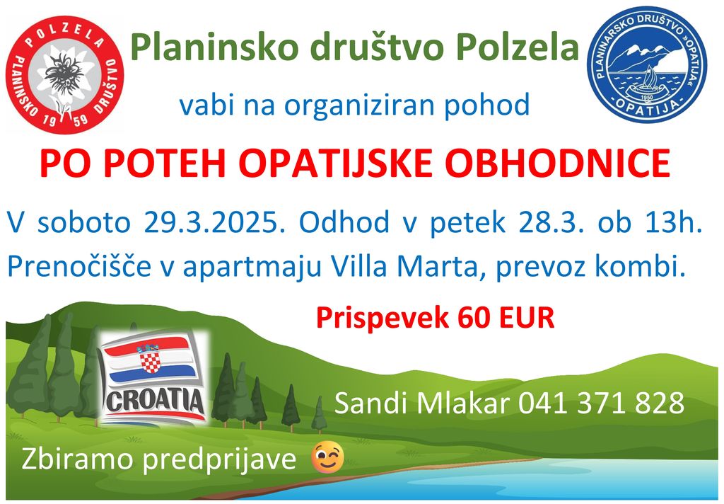 Planinsko društvo Polzela in Planinsko društvo Opatija vabita na tradicionalni pohod po Opatijski planinski obhodnici, ki bo v soboto 29. marca 2025
