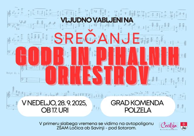V okviru občinskega praznika vabljeni, v nedeljo, 28. septembra ob 17. uri, na Srečanje pihalnih godb na grad Komenda. V primeru slabega vremena bo dogodek pod šotorom na avtopoligonu ZŠAM Ločica ob Savinji.