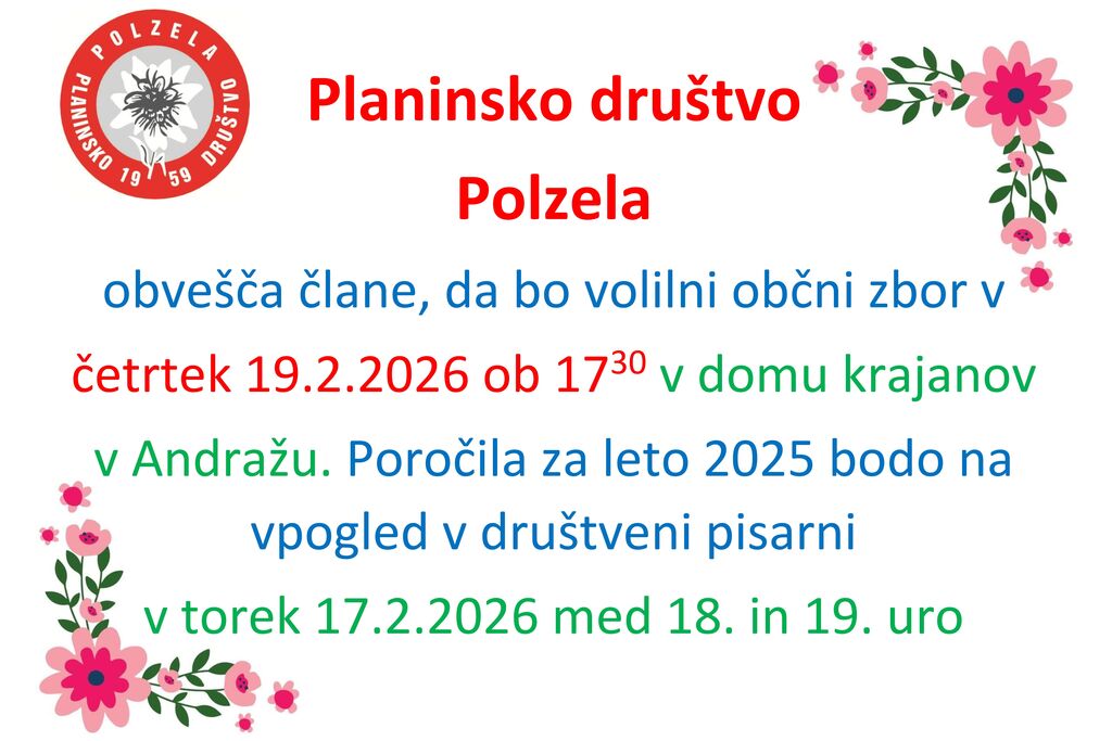 V četrtek 19. februarja 2026, vas vabimo na redni občni zbor Planinskega društva Polzela, ki bo v Domu krajanov v Andražu nad Polzelo ob 1730 uri