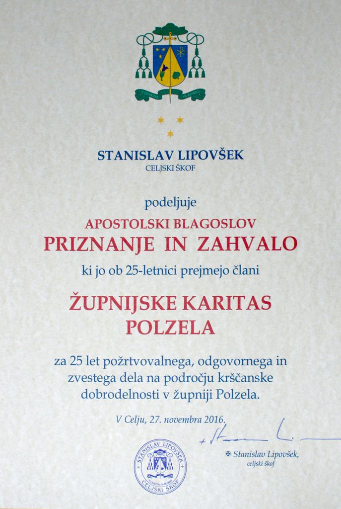 Praznovanje je po večerni maši 26. novembra 2021 obogatil Gregor Čušin, duhoviti oznanjevalec evangelija. Obiskovalce je najprej nagovoril podžupan Miloš Mihael Frankovič v imenu Občine Polzela ter prenesel zahvalo in voščilo župana Jožeta Kužnika ob 30-letnici Župnijske Karitas Polzela. Poleg dejavnosti v izjemnih okoliščinah koronavirusne epidemije je pohvalil tudi siceršnje pozitivno in koristno delovanje Karitas na območju občine in župnije. Prav tako se je zahvalil za častitljivi križ, ki je nekoč stal na zasebnem zemljišču v Celju, Karitas pa ga je poklonila občini, da je zdaj po županovi zaslugi obnovljen postavljen na Sevčniku. Darilo, ki ga je izročil, je zahvala za vsa dela, ki jih opravimo v dobro pomoči potrebnim, in sodelovanje z drugimi organizacijami (Škofijska Karitas, občina, zdravstvo, sociala, Rdeči križ, Šenek ...).