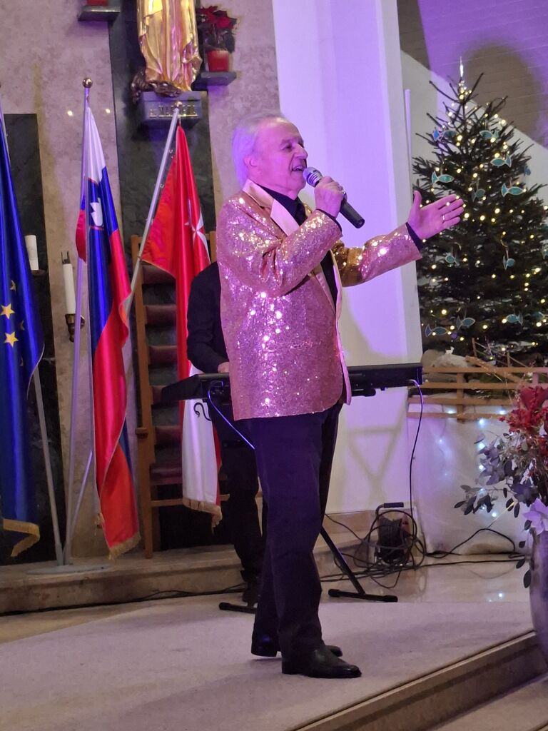 Posebno mesto večera je pripadalo Alfiju Nipiču, ikoni slovenske glasbe, ki že več kot šest desetletij bogati slovenski glasbeni prostor. Svojo glasbeno pot je začel že v mladih letih, širši javnosti pa se je zapisal v srce kot eden izmed najprepoznavnejših glasov zabavne in narodno-zabavne glasbe. Sodeloval je z največjimi imeni slovenske glasbene scene, med drugim z Ansamblom Lojzeta Slaka, in s številnimi uspešnicami zaznamoval generacije poslušalcev. Pesmi, kot je legendarni Silvestrski poljub, so postale del naše skupne glasbene dediščine, Alfijeva interpretacija pa še danes navdušuje s toplino, iskrenostjo in spoštovanjem do poslušalcev. Na koncertu je s svojo karizmo in glasbeno zrelostjo skupaj z zasedbo ustvaril vzdušje, ki je presegalo običajen koncertni okvir ter se dotaknilo src vseh navzočih. Praznični večer je bil tako prežet z glasbo, spomini in hvaležnostjo.