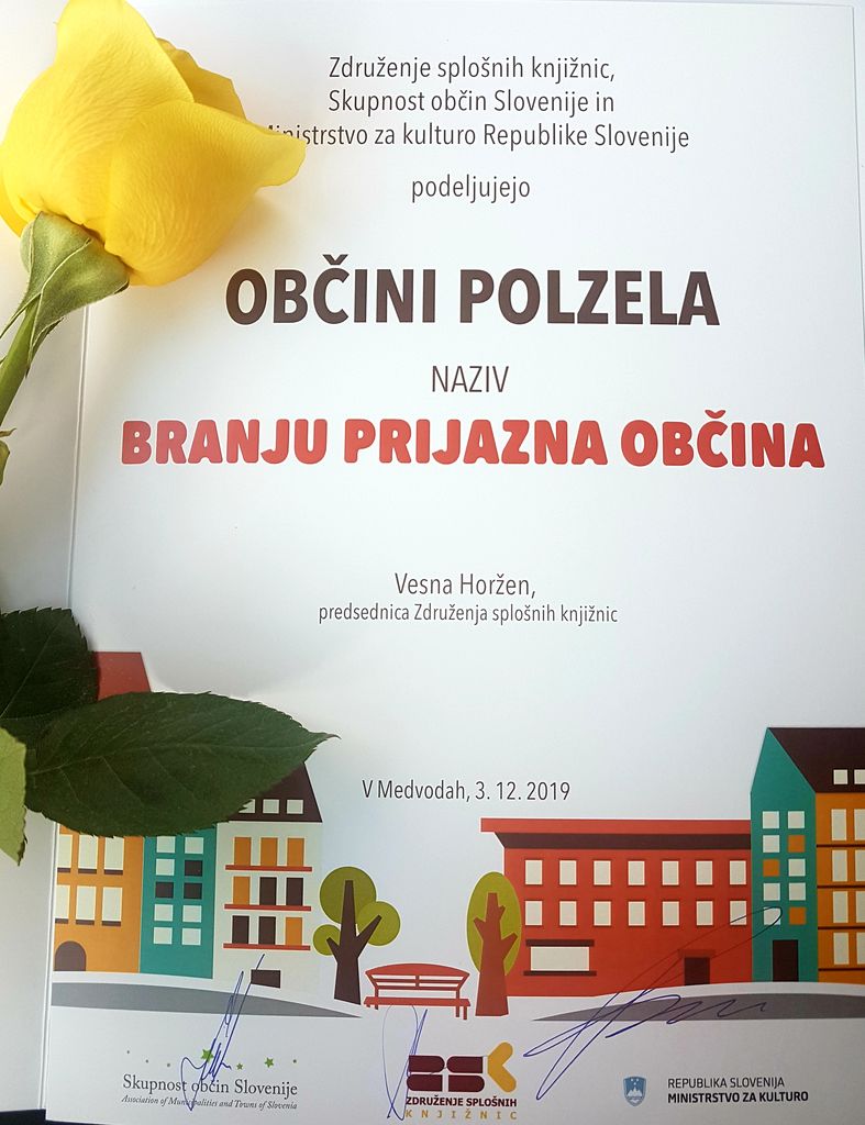 Predstavniki Združenja splošnih knjižnic, Skupnosti občin Slovenije in Ministrstva za kulturo Republike Slovenije so v torek, 3. decembra 2019, v Kulturnem domu Medvode županu Občine Polzela Jožetu Kužniku izročili listino, s katero se Občini Polzela dodeljuje naziv »branju prijazna občina«. Tako se je Občina Polzela uvrstila med 18 % slovenskih občin, ki jim je do zdaj uspelo pridobiti ta naziv. Majhen odstotek občin dokazuje, da pot do tega naziva ni preprosta.