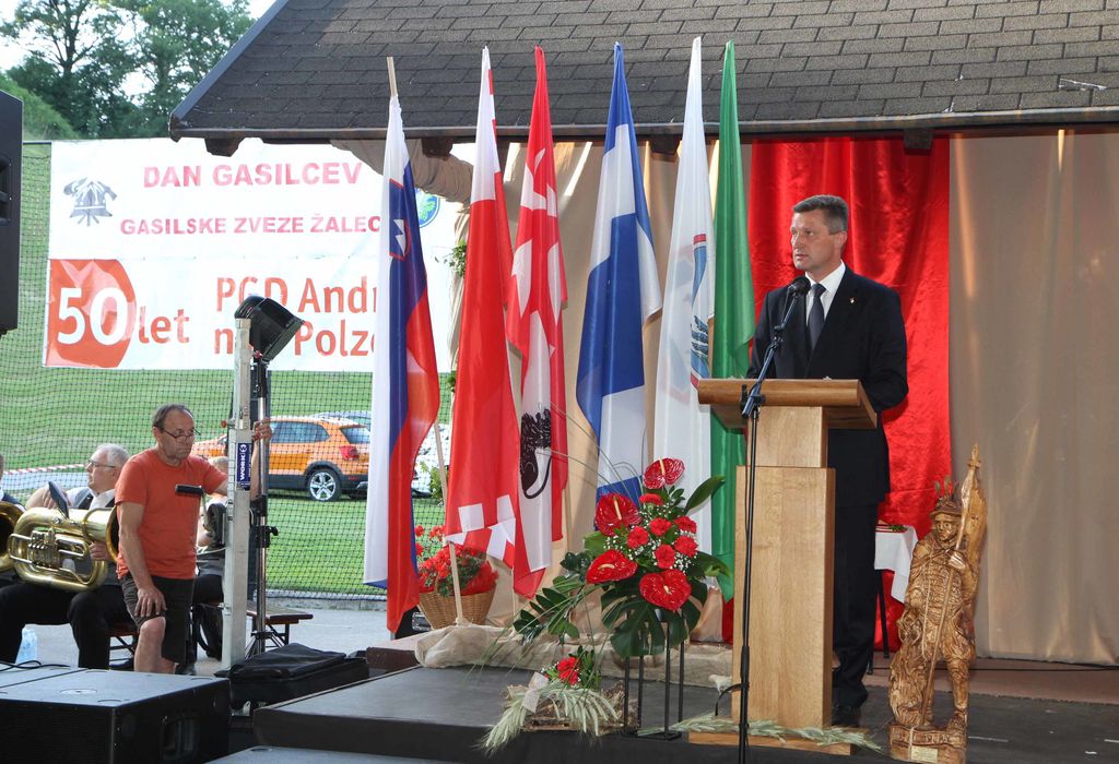 Ob 50-letnici društva PGD Andraž je nato govoril njen predsednik David Zabukovnik in med drugim dejal: "Začeli smo z 29 člani, trenutno nas je v društvu 219 članov. Prvih 25 let je zaznamovalo zagotavljanje pogojev za delovanje. Odločitev o vzpostavitvi društva, zagotovitev prvih prostorov, nabava prve motorne brizgalne, nabava prvega gasilskega vozila, sestavljanje prvih desetin in zelo velik dosežek, gradnja novega gasilskega doma na novi lokaciji. Drugih 25 let zaznamuje intenzivno delo na vseh področjih delovanja društva. Opremili smo se s sodobno gasilsko tehniko, usposabljali članstvo, skozi različne aktivnosti skrbeli za vzdrževanje članstva v društvu in poskrbeli za investicijsko vzdrževanje gasilskega doma. V zadnjem obdobju smo ponosni na pridobitev večjega gasilskega vozila s cisterno z oznako AC 24/50, danes pa bomo svojemu namenu predali novo motorno brizgalno." Ob koncu govora je dejal, da bodo naslednji mesec v Celju ponovno stiskali pesti za mladinke Andraža, ki bodo nastopile na gasilski olimpijadi.