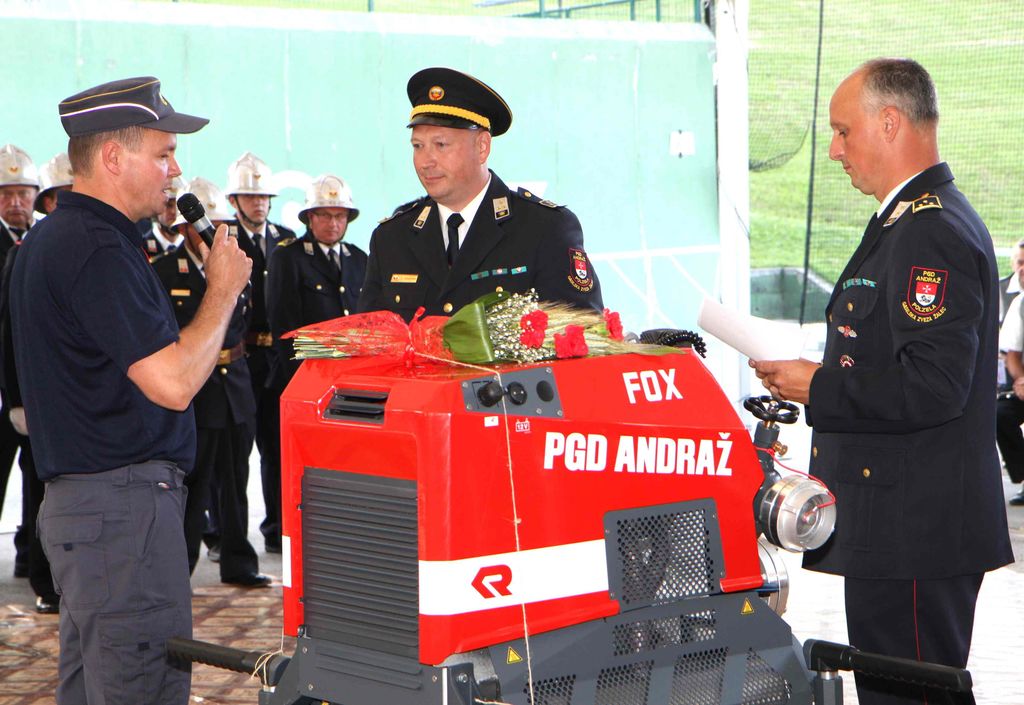 Ob 50-letnici društva PGD Andraž je nato govoril njen predsednik David Zabukovnik in med drugim dejal: "Začeli smo z 29 člani, trenutno nas je v društvu 219 članov. Prvih 25 let je zaznamovalo zagotavljanje pogojev za delovanje. Odločitev o vzpostavitvi društva, zagotovitev prvih prostorov, nabava prve motorne brizgalne, nabava prvega gasilskega vozila, sestavljanje prvih desetin in zelo velik dosežek, gradnja novega gasilskega doma na novi lokaciji. Drugih 25 let zaznamuje intenzivno delo na vseh področjih delovanja društva. Opremili smo se s sodobno gasilsko tehniko, usposabljali članstvo, skozi različne aktivnosti skrbeli za vzdrževanje članstva v društvu in poskrbeli za investicijsko vzdrževanje gasilskega doma. V zadnjem obdobju smo ponosni na pridobitev večjega gasilskega vozila s cisterno z oznako AC 24/50, danes pa bomo svojemu namenu predali novo motorno brizgalno." Ob koncu govora je dejal, da bodo naslednji mesec v Celju ponovno stiskali pesti za mladinke Andraža, ki bodo nastopile na gasilski olimpijadi.