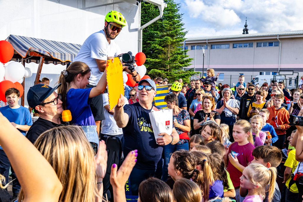 V torek, 4. junija 2024, je na šolski stadion na Polzeli malo pred 18. uro, ko se je po izjemno deževnem popoldnevu naredil krasen dan, iz Občine Braslovče skupaj z ekipo kolesarjev na kvadrociklu prikolesaril Miha Deželak z našo občanko in pevko Tinkaro Fortuna. Uvodni pozdrav v špalirju z gasilskimi sirenami in lučkami so mu namenili naši gasilci vseh treh gasilskih enot: Andraž nad Polzelo, Ločica ob Savinji in Polzela, zatem pa smo ga z bučnim aplavzom in občinsko zastavico v rokah pozdravili vsi preostali. S Tinkaro Fortuna smo odplesali najnovejšo skladbo Počitnice, ki jo je Tinkara posnela tudi za novo nastali videospot. Vidno ganjen in presenečen nad obiskom je bil tudi Deželak Junak. Moderatorsko vlogo sta profesionalno opravila Božena Brunšek Krk in Dejan Tamše, ki sta vneto in suvereno spodbujala k navijanju in aplavziranju v podporo Deželaku Junaku.