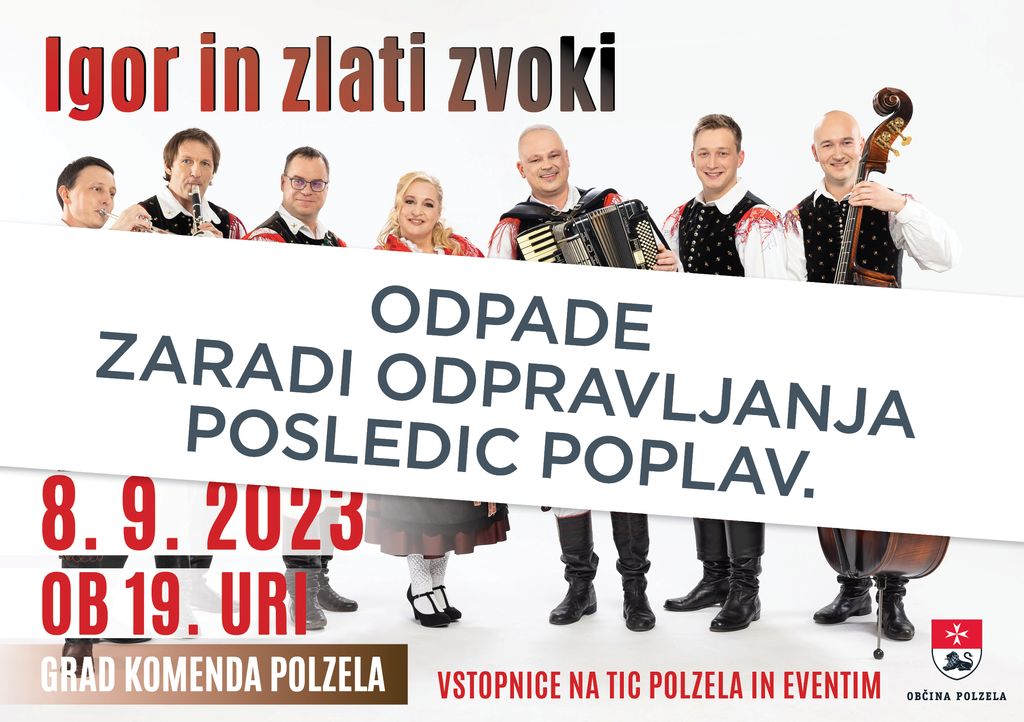 Obveščamo vas, da koncert Igorja in zlatih zvokov zaradi odpravljanja posledic poplav ne bo.