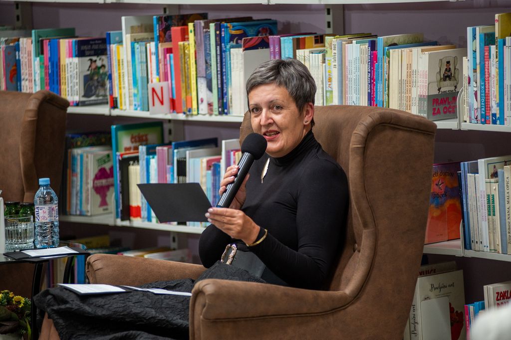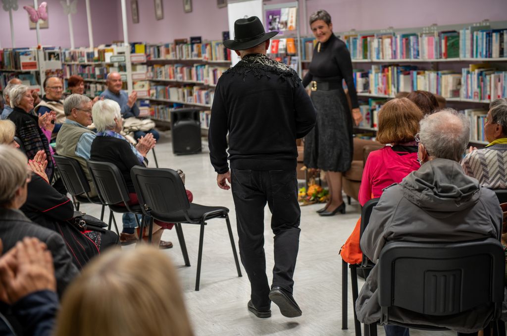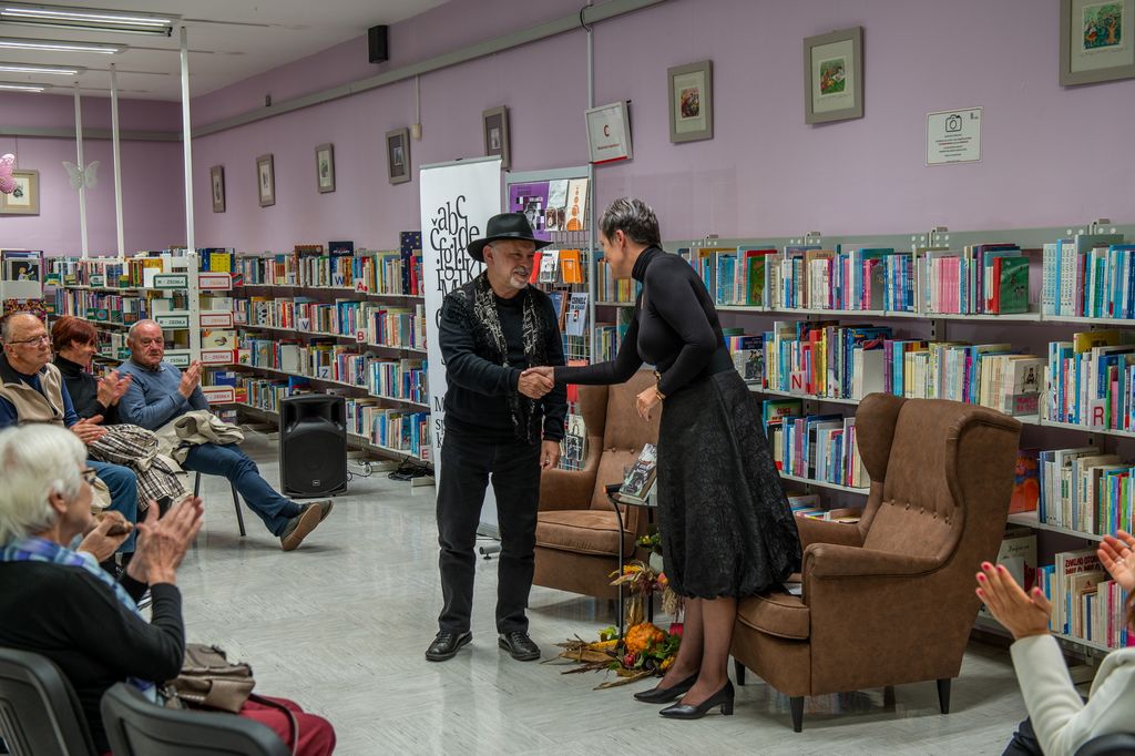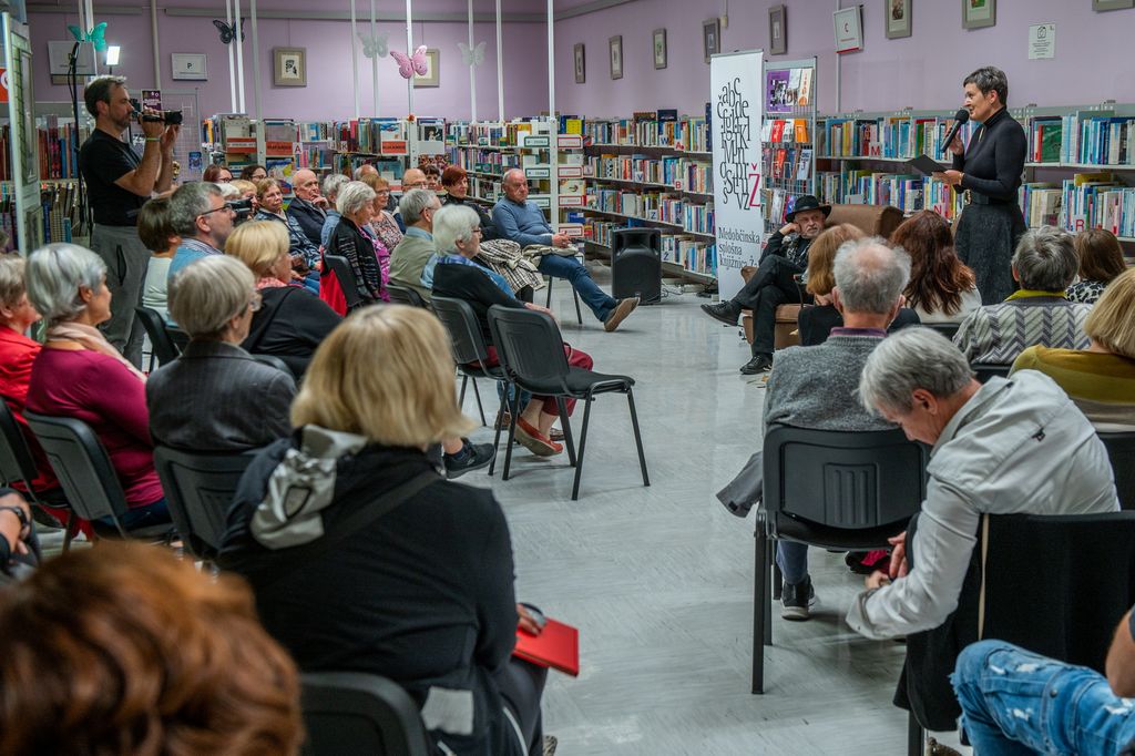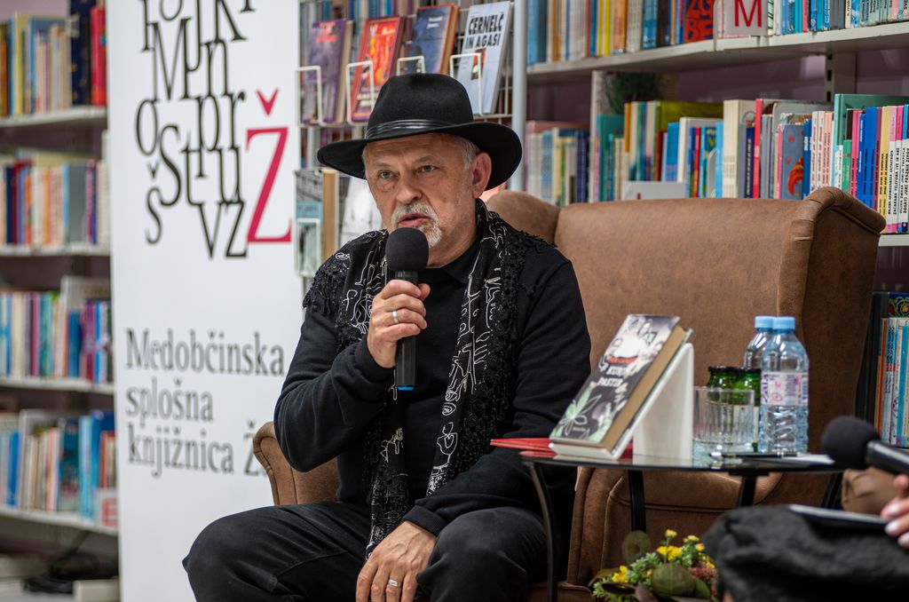 Nabito polno žalsko knjižnico je pisatelj na koncu navdušil tudi z recitiranjem pesmi v prekmurščini.