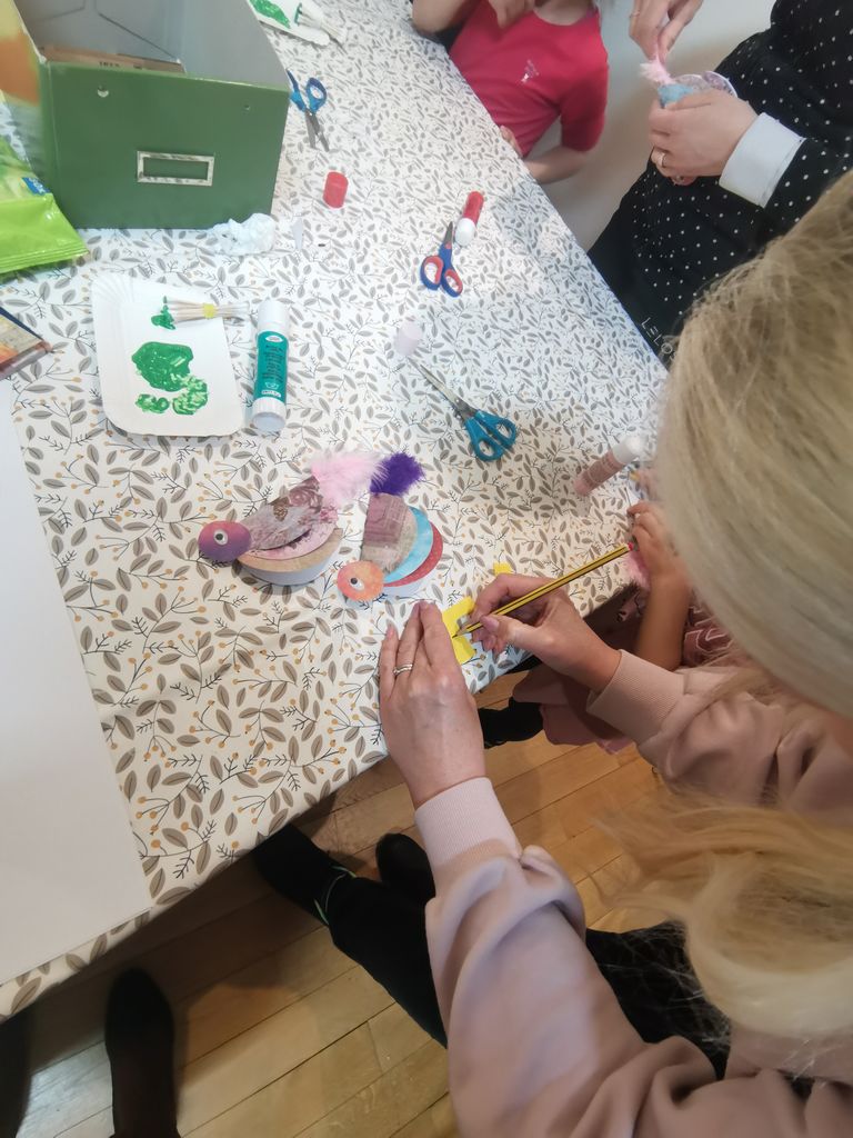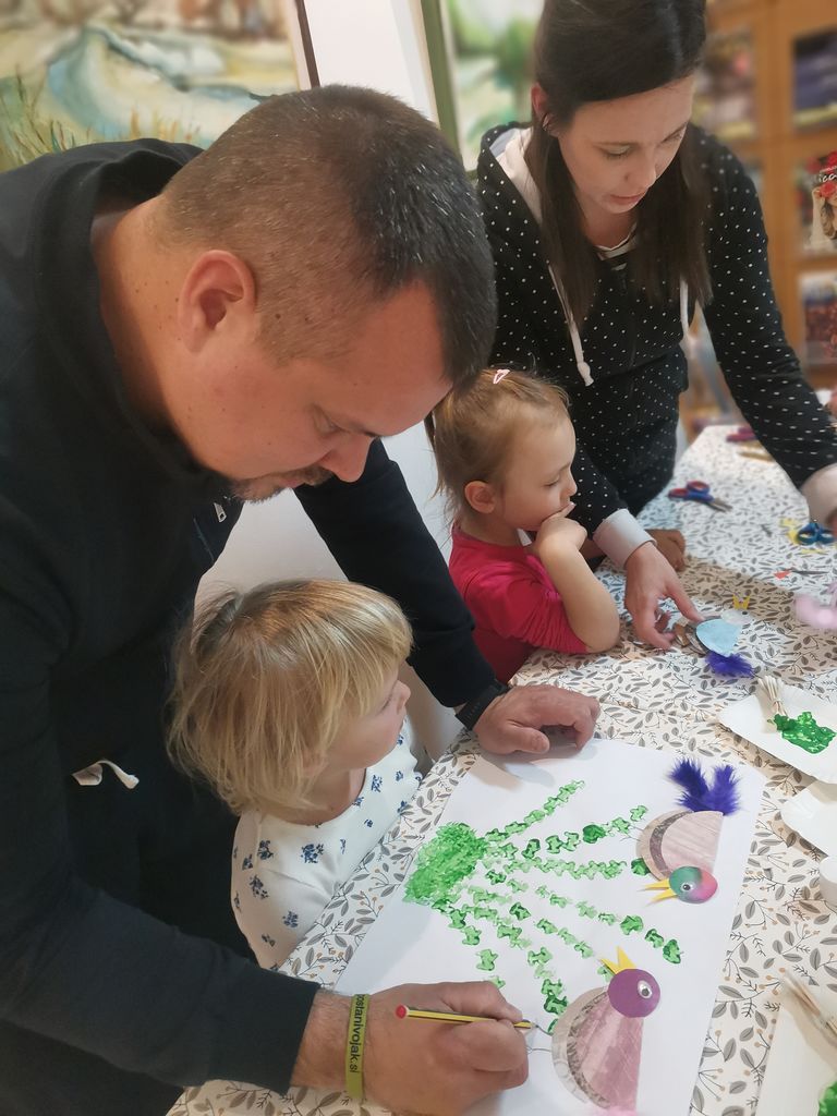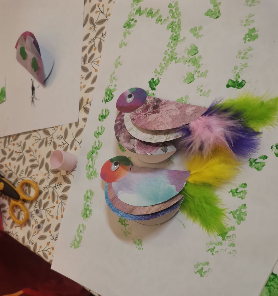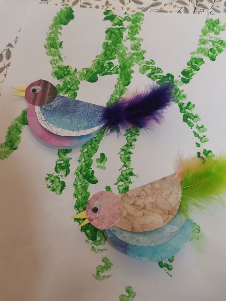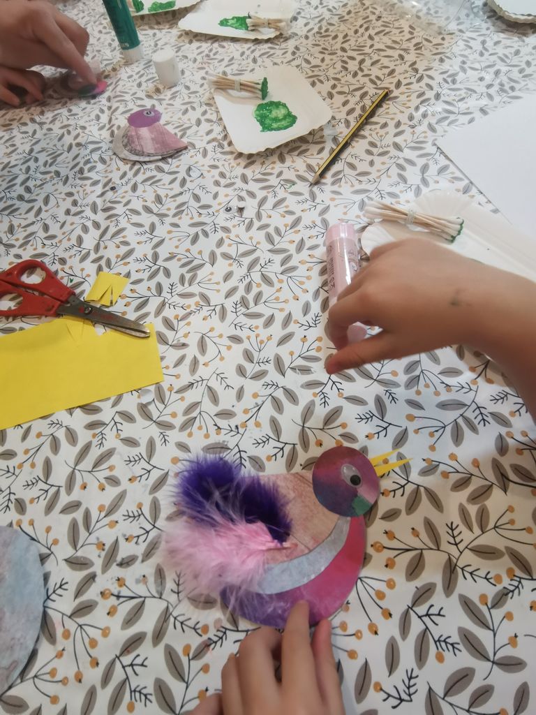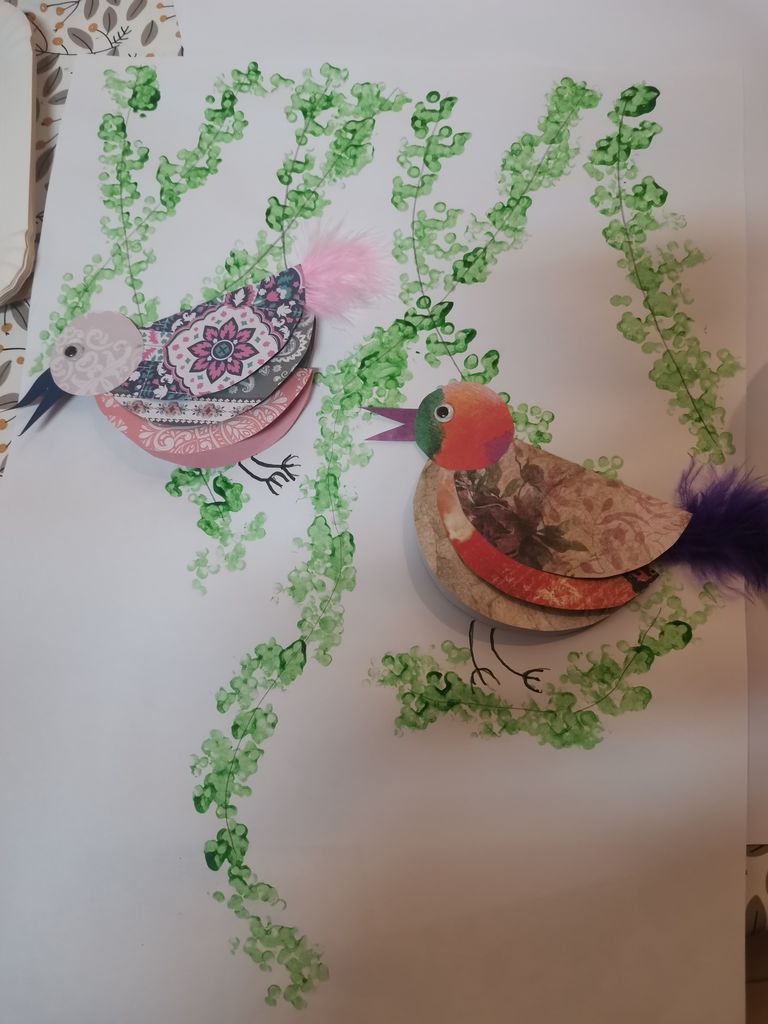 Čeprav se je bližal čas velikonočnih pirhov, smo delali papirnate rajske ptice, ki s svojo barvitostjo tudi spadajo v ta praznični čas. Veselje jih je bilo videti - kot da bodo vsak čas poletele.