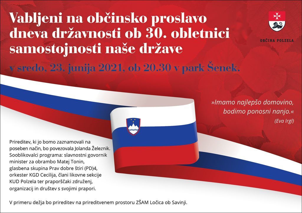 Lepo vabljeni na občinsko proslavo dneva državnosti ob 30. obletnici