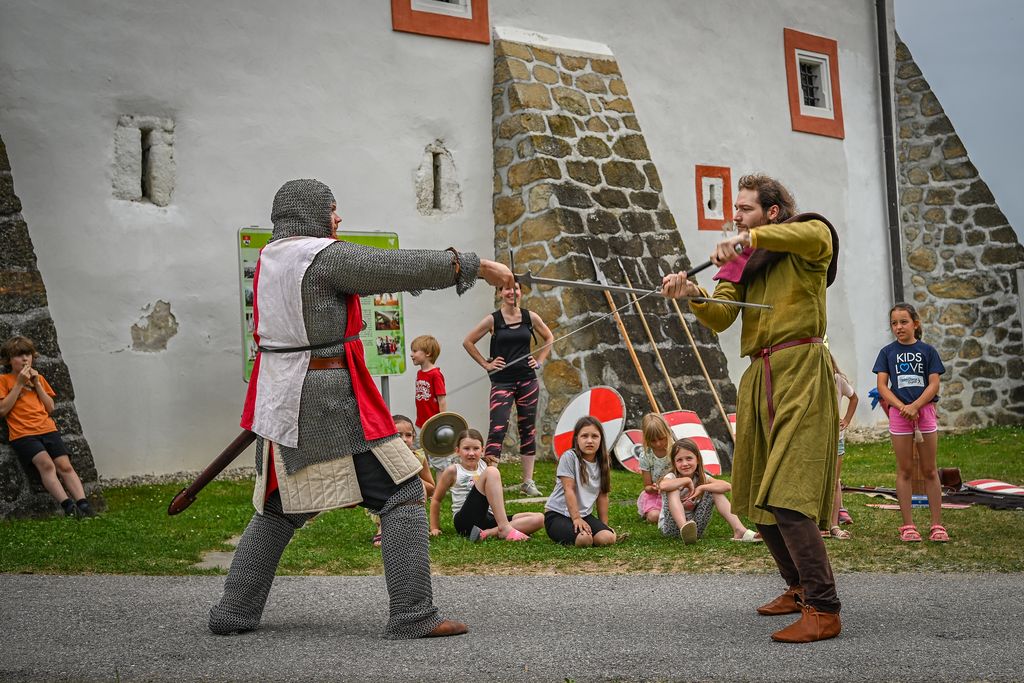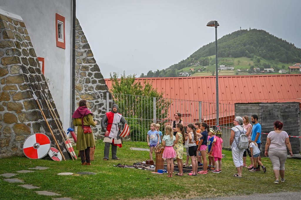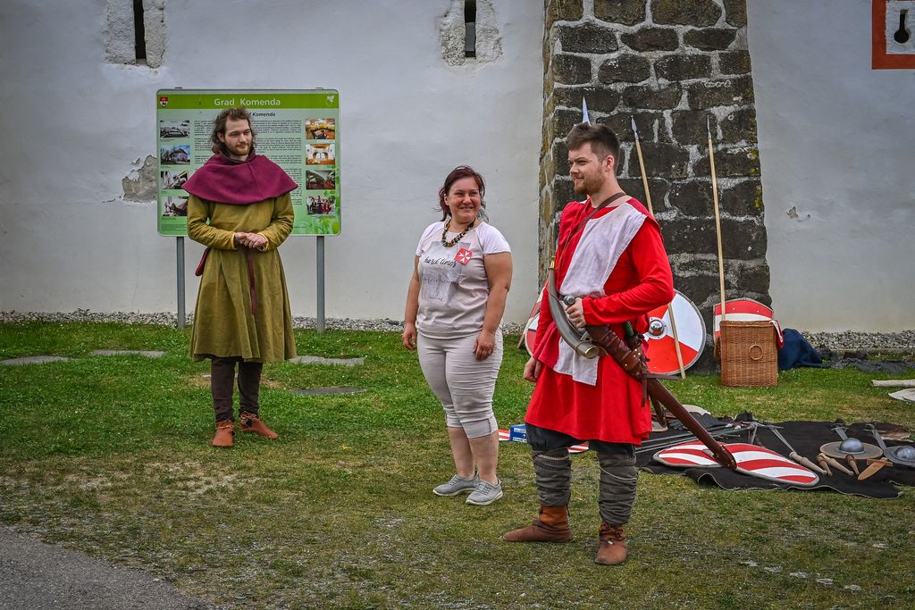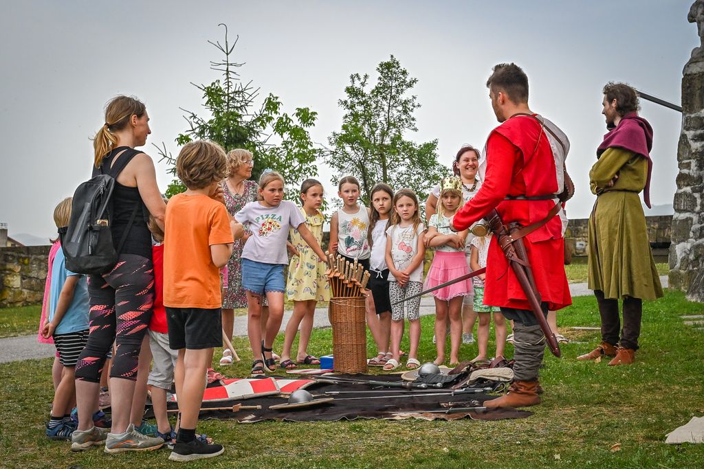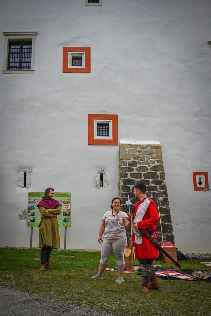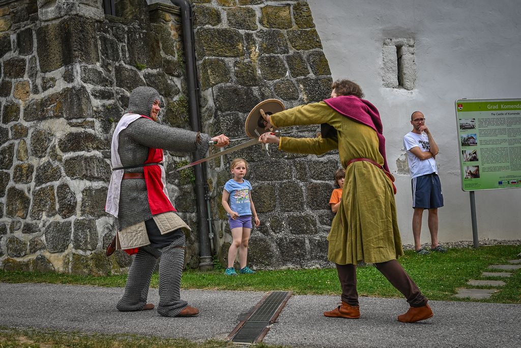 Potem sta na grajsko dvorišče prispela viteza iz prikazovalne podskupine Društva Vitez Kulturnega društva Žovnek Braslovče. Prikazala sta težavno oblačenje v verižno viteško obleko in mečevanje. Bila sta prava paša za oči. Otroci so se tudi sami lahko spopadli z njima. Na koncu smo pod čudovito grajsko platano še zaplesali in tako sklenili barvito druženje na grajskem dvorišču.