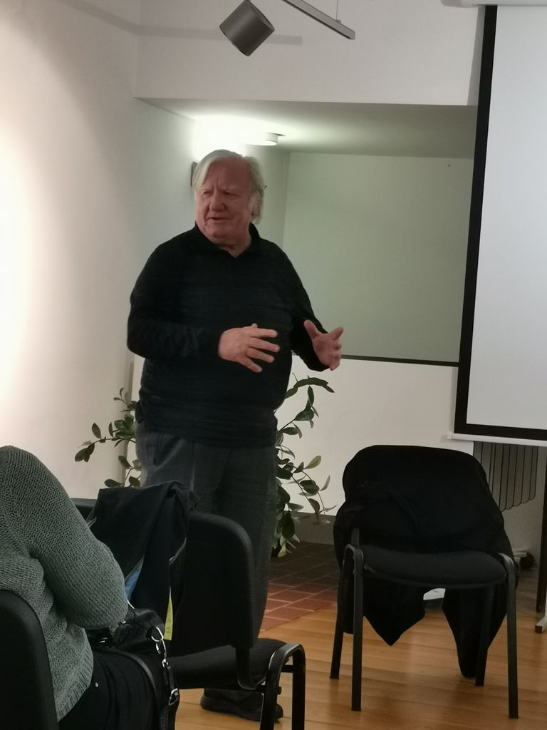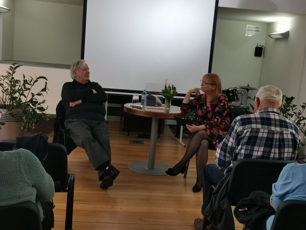 V pogovoru z bibliotekarko Ireno Štusej sta uvodoma razkrila retrospektivo njegovega ustvarjanja. Več kot trideset komedij je napisal, bil je zaposlen v gledališču kot dramaturg in umetniški vodja, nekaj časa poslanec, kot upokojenec pa piše obsežna prozna dela: Pasja ulica, Pesnica, Sebastjan in most, Ljudje z otoka, Ljudje iz Maribora in nazadnje Veter z vzhoda.