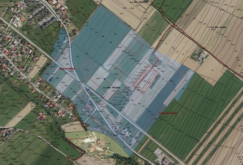 Območje legijskega tabora (pobarvano z modro) na podlagi DOF in katastru (vir: EvRD), z vrisanimi odkritimi strukturami, ki jih je odkril Lorger (izrisano z rdečo) (po Kandler, 1979, AV 30).