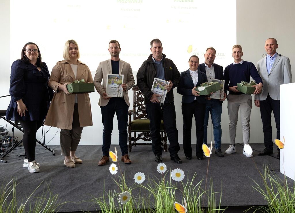 Slika T mleko: Podelitev priznanj največjim rejcem (od leve proti desni: Stanka Kotnik Krenker, vodja nabave osnovne surovine v Mlekarni Celeia, Blaž Cizej s soprogo, Mitja in Vesna Tekavc, Marko Obrul s sinom in direktor Mlekarne Celeia Vinko But)