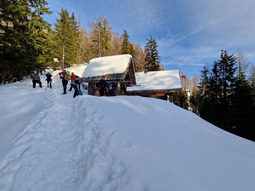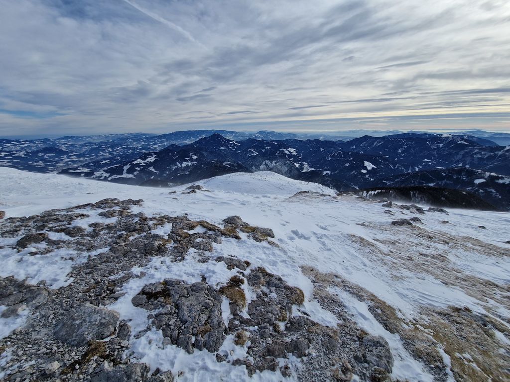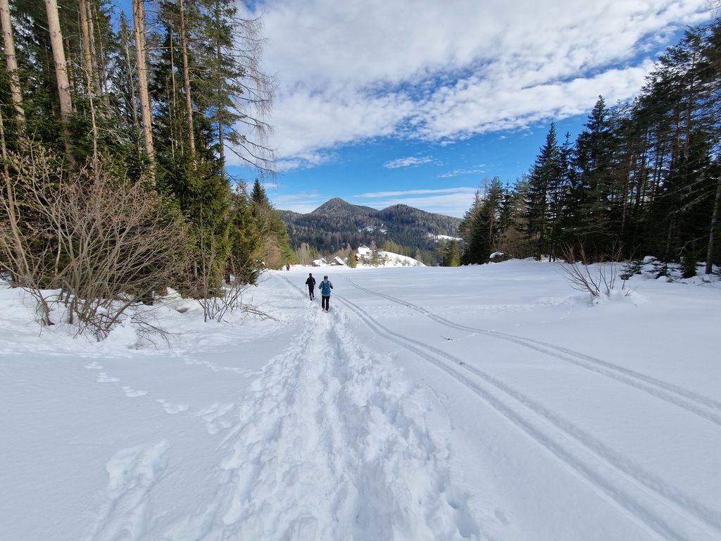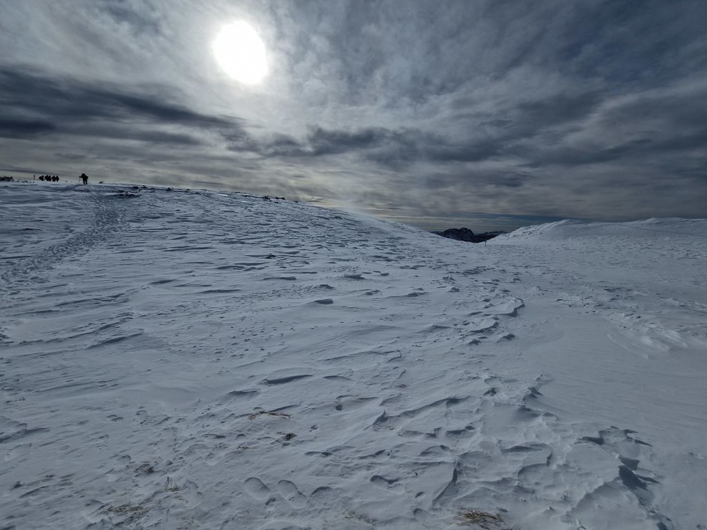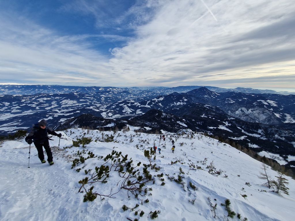 Jutro v Podpeci je bilo lepo in mrzlo. Termometer na eni izmed hiš na začetku poti je kazal -10 oC. Ker so vremenoslovci obljubljali lepo vreme, se je na pohod odpravilo veliko planincev iz vse Slovenije, da bi uživali v zimski pravljici na gori. Nam jo je pa tokrat kralj Matjaž malo zagodel, saj smo imeli na vrhu močan veter, ki je sproti brisal naše sledi v snegu. Na vrhu smo se ustavili samo za obvezno fotografiranje, nato pa se hitro spustili nazaj do koče, kjer nas je pričakalo pravo pomladno vreme. Pred kočo smo zasedli še zadnjo prosto klop in si privoščili daljši počitek.