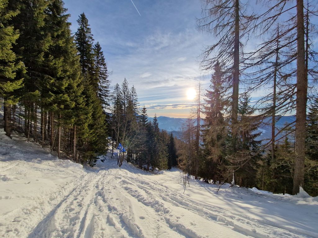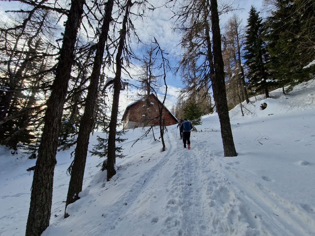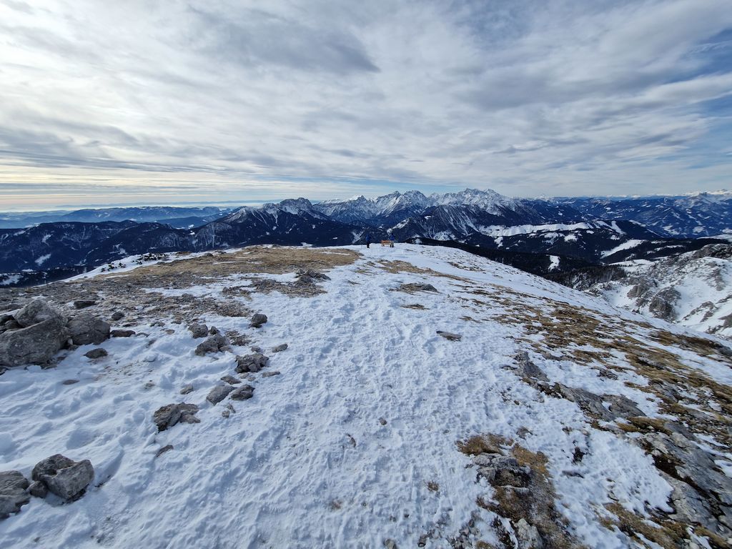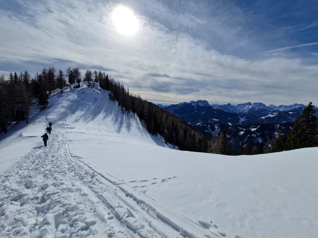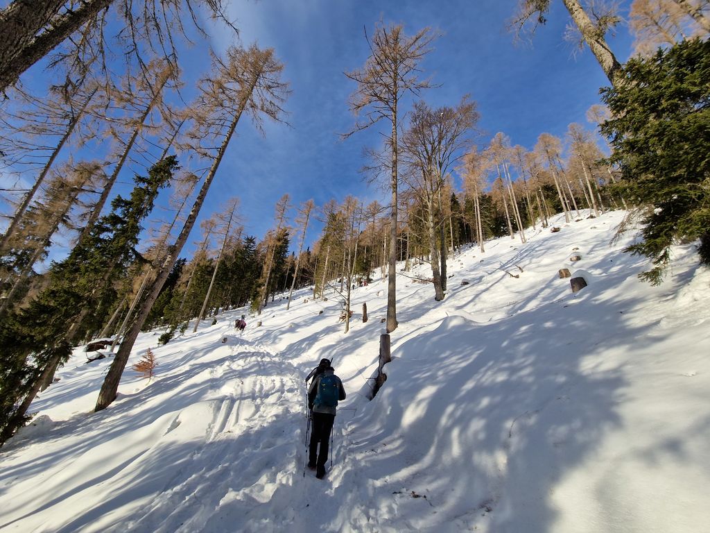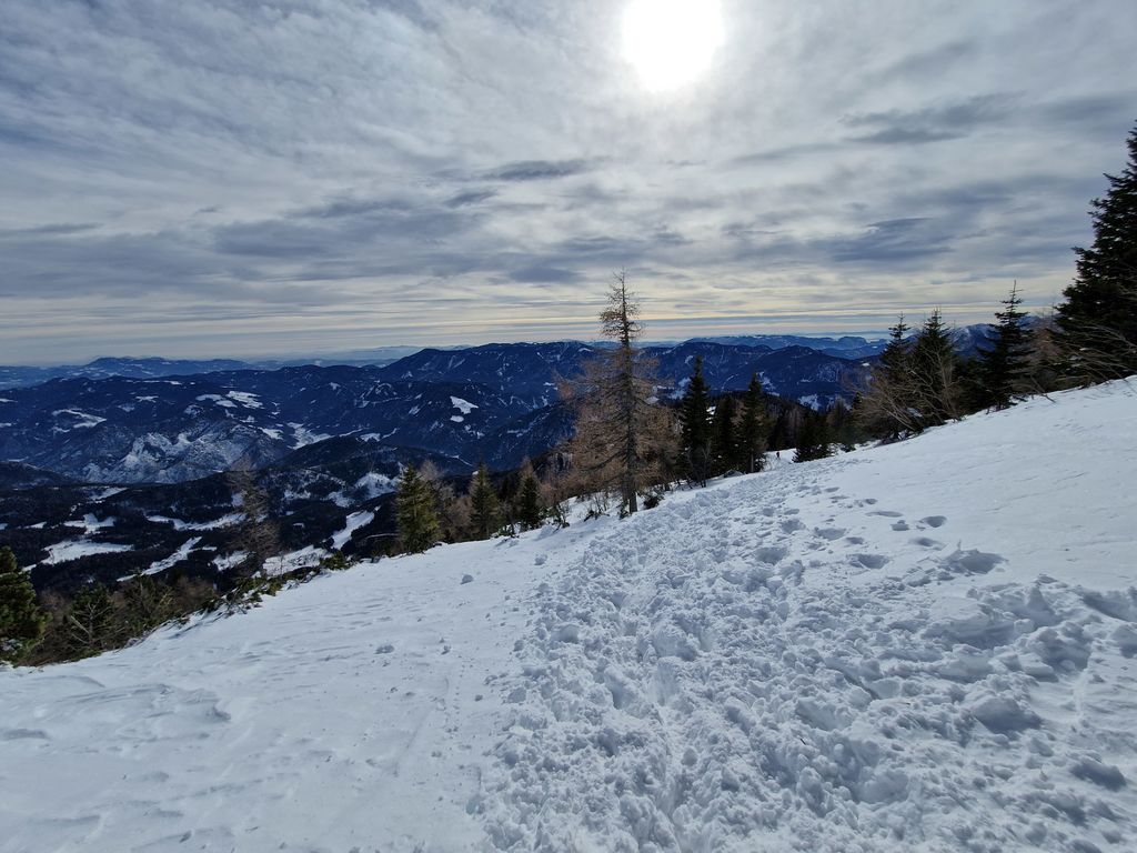Jutro v Podpeci je bilo lepo in mrzlo. Termometer na eni izmed hiš na začetku poti je kazal -10 oC. Ker so vremenoslovci obljubljali lepo vreme, se je na pohod odpravilo veliko planincev iz vse Slovenije, da bi uživali v zimski pravljici na gori. Nam jo je pa tokrat kralj Matjaž malo zagodel, saj smo imeli na vrhu močan veter, ki je sproti brisal naše sledi v snegu. Na vrhu smo se ustavili samo za obvezno fotografiranje, nato pa se hitro spustili nazaj do koče, kjer nas je pričakalo pravo pomladno vreme. Pred kočo smo zasedli še zadnjo prosto klop in si privoščili daljši počitek.