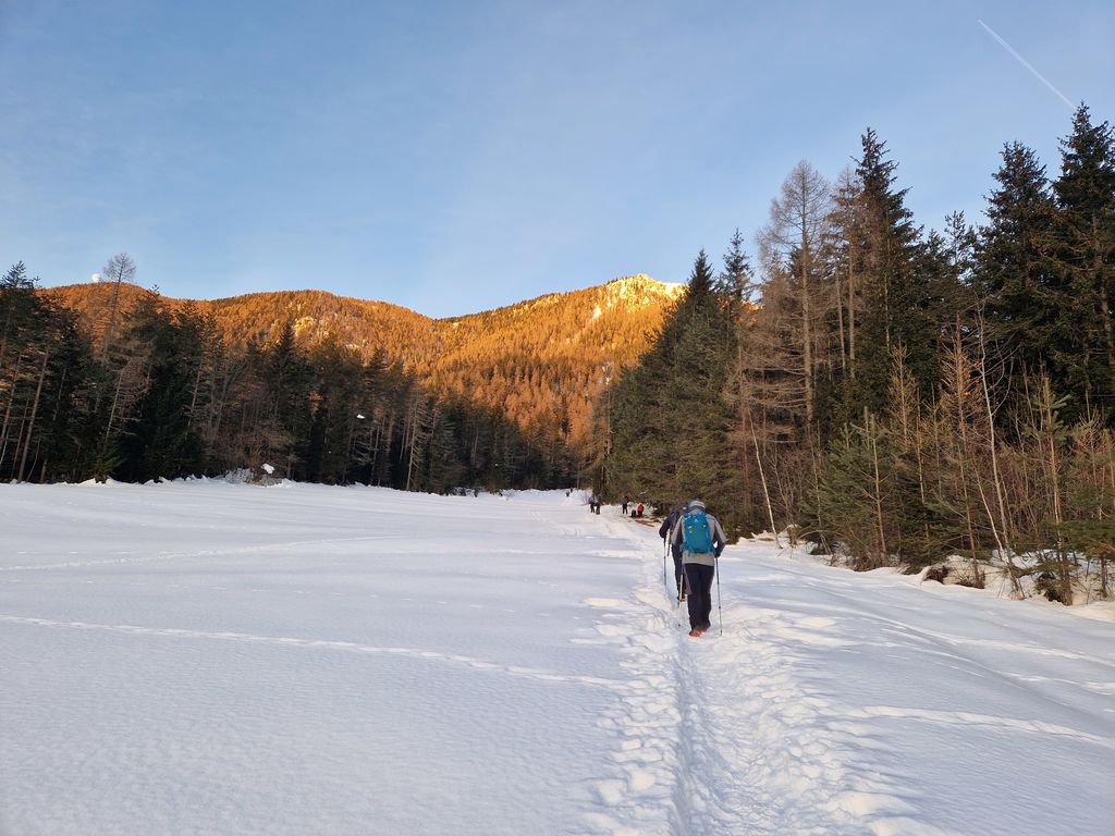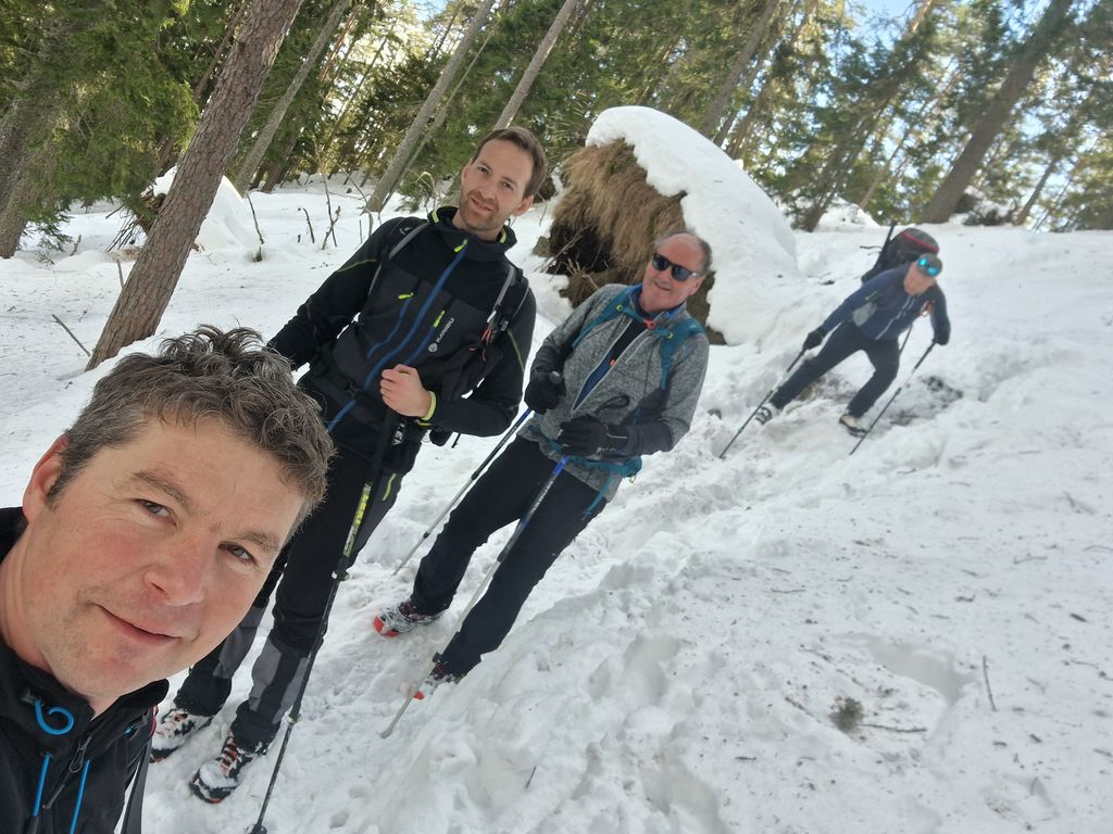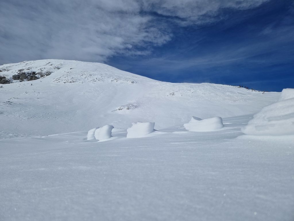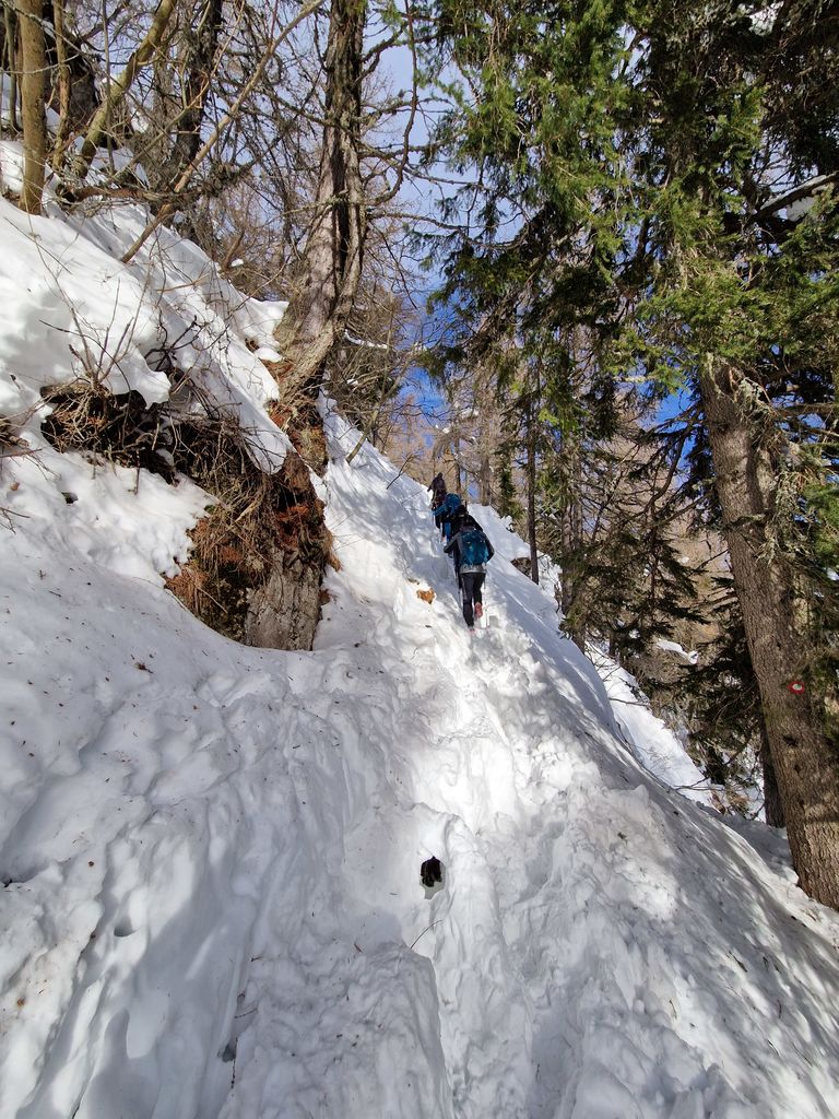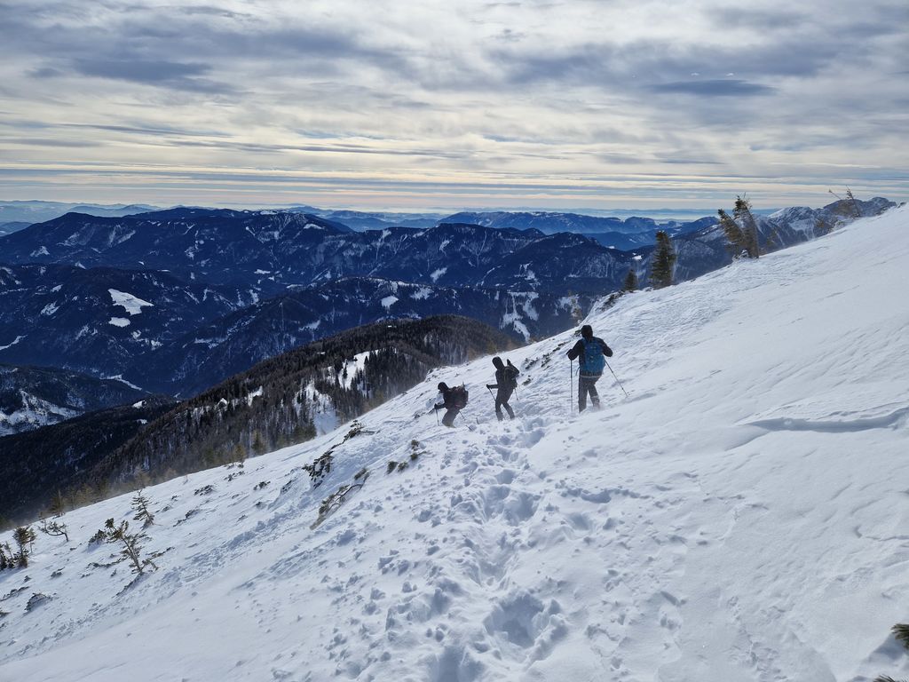 Jutro v Podpeci je bilo lepo in mrzlo. Termometer na eni izmed hiš na začetku poti je kazal -10 oC. Ker so vremenoslovci obljubljali lepo vreme, se je na pohod odpravilo veliko planincev iz vse Slovenije, da bi uživali v zimski pravljici na gori. Nam jo je pa tokrat kralj Matjaž malo zagodel, saj smo imeli na vrhu močan veter, ki je sproti brisal naše sledi v snegu. Na vrhu smo se ustavili samo za obvezno fotografiranje, nato pa se hitro spustili nazaj do koče, kjer nas je pričakalo pravo pomladno vreme. Pred kočo smo zasedli še zadnjo prosto klop in si privoščili daljši počitek.