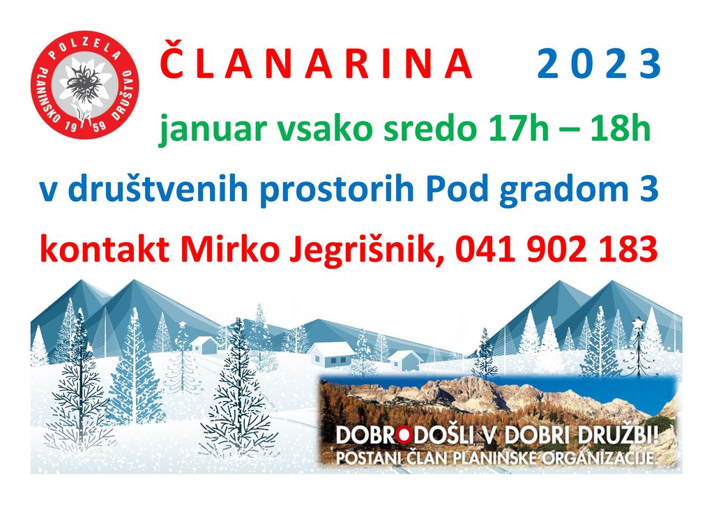 Inflacija in vsesplošne podražitve so žal zahtevale tudi dvig planinske članarine za leto 2023. K sreči ostajajo ugodnosti in višine članskega zavarovanja nespremenjene. Članarino lahko poravnate v pisarni Planinskega društva Polzela, Pod gradom 3, vsako sredo od 17. do 18. ure, GSM: 041 902 183 (Mirko Jegrišnik).