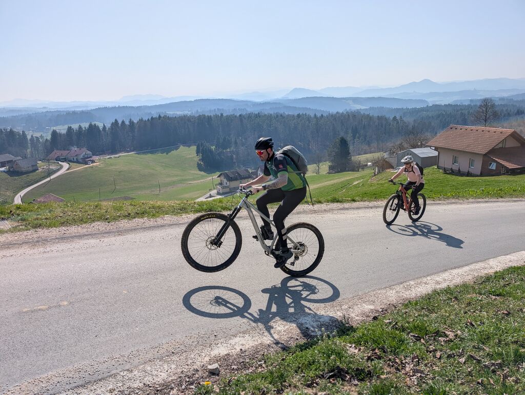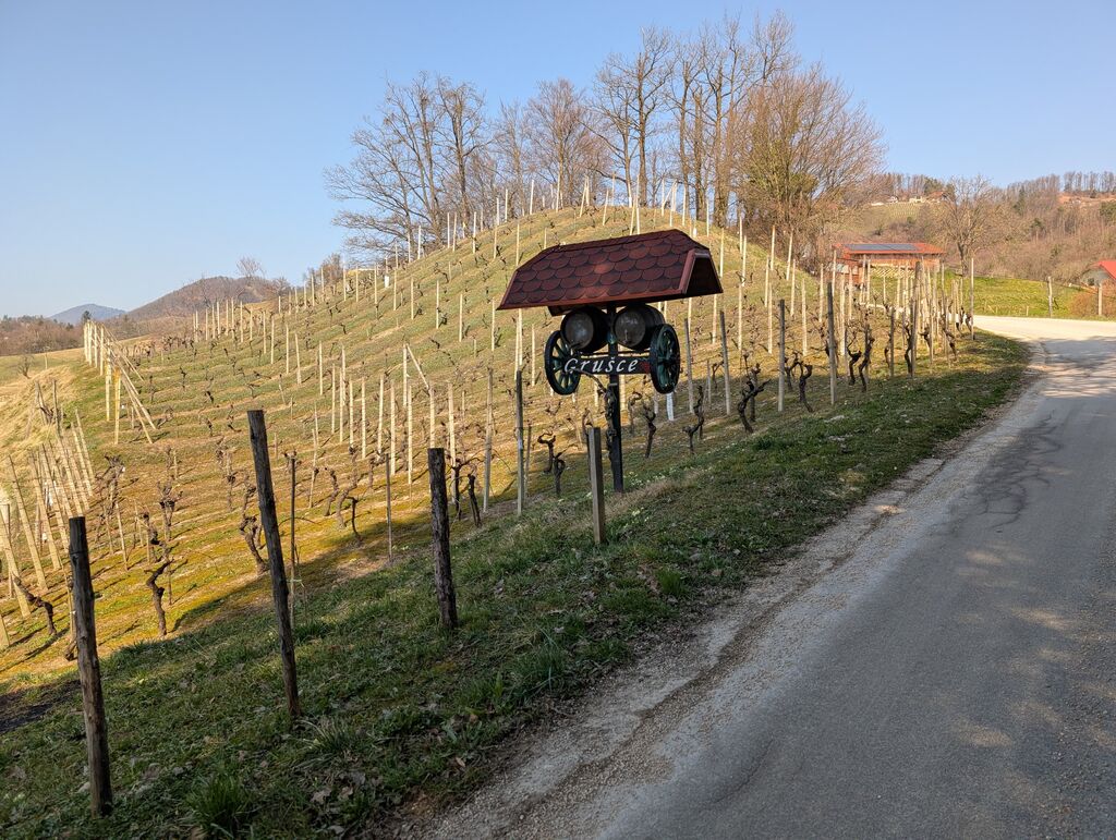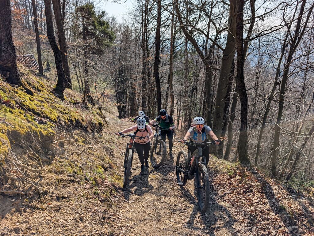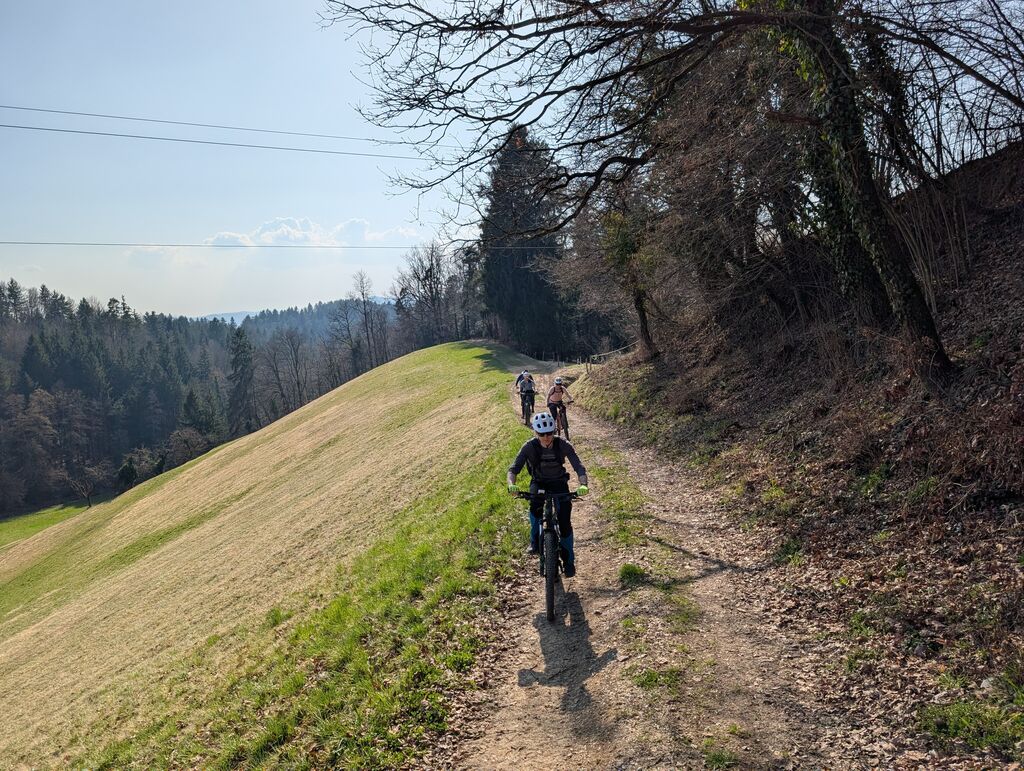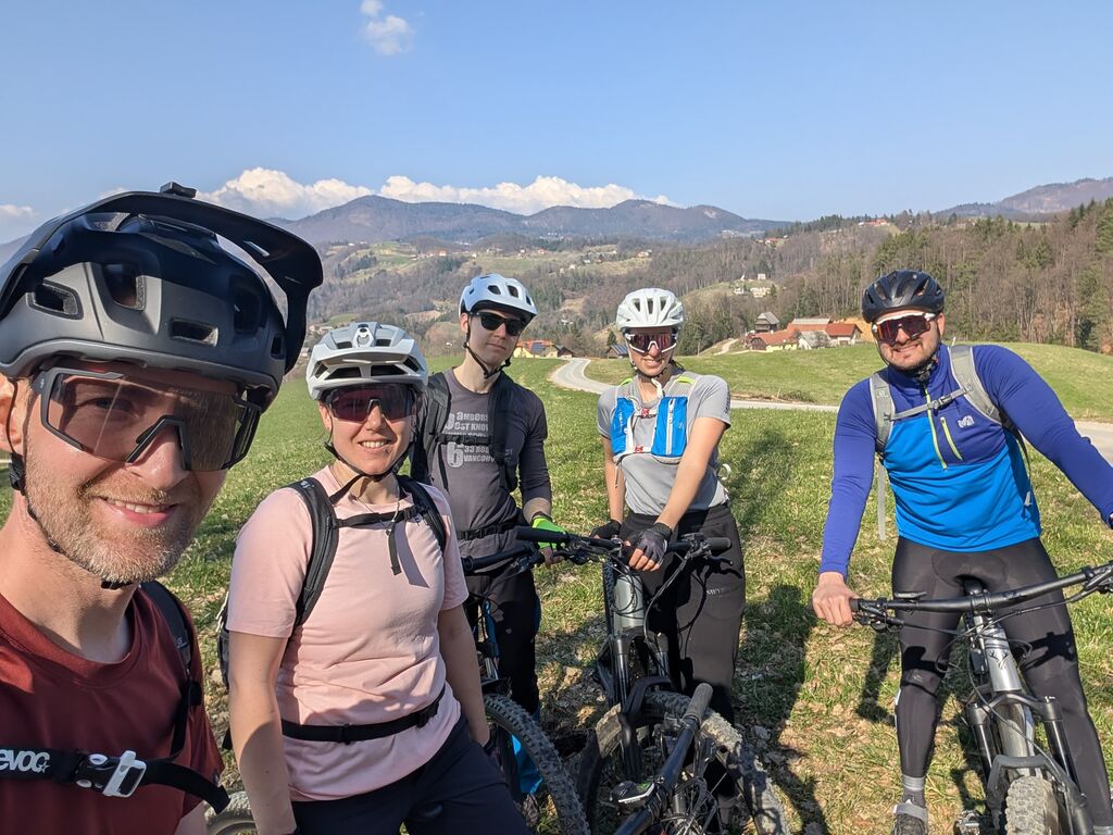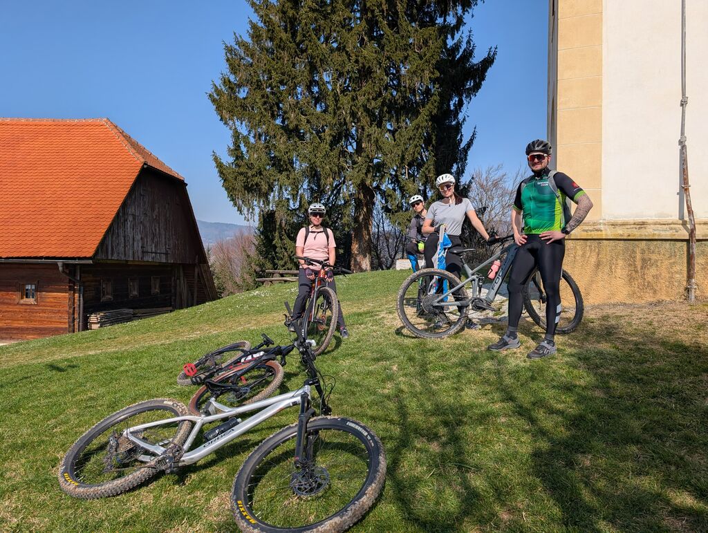 Na izhodišču v Šentjurju smo preverili, da so kolesa po zimi še v formi. Proti prvemu cilju – Sv. Uršuli, razglednem hribu nad Dramljami, smo se podali čez Primož in Razbor. Kolesarsko stezo je kmalu zamenjal makadam, proti vrhu pa je postalo tudi precej strmo. Na vrhu smo uživali v soncu in razgledih proti Savinjski dolini, Kozjanskemu in Konjiški gori. Po STKP smo nadaljevali v smeri Grušc. Po kratkem spustu smo zagrizli v strme klance drameljskih gorc in se mimo vinogradov prebijali proti vrhu grebena. Tu se STKP usmeri proti Boču, mi pa smo se po vlaki spustili proti Žički kartuziji in si v Gastužu privoščili kavo. Po obveznem fotografiranju smo se povzpeli nazaj proti Gori, se po stranskih poteh spustili v Dramlje in po STKP mimo partizanske bolnice Zima vrnili na izhodišče v Šentjur. Krožno pot smo po 38 km zaključili s slabimi 1100 metri vzpona.