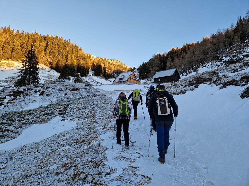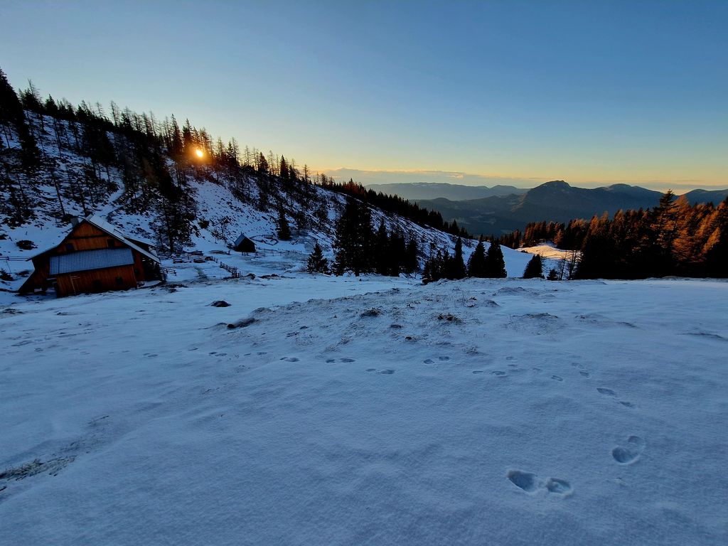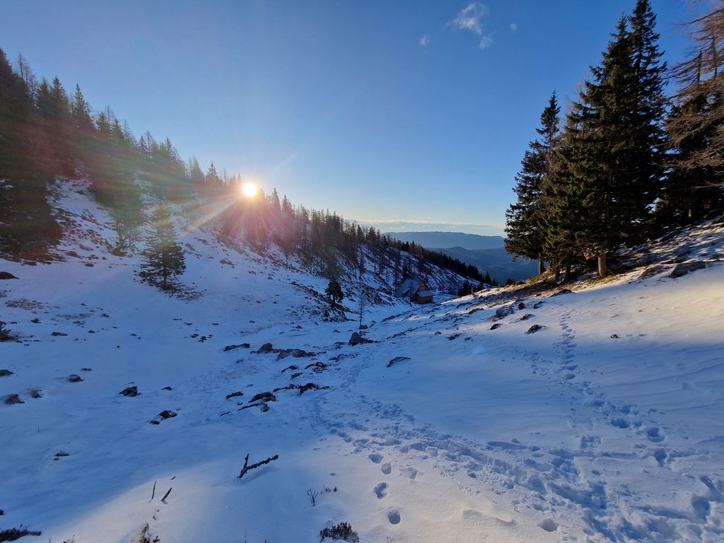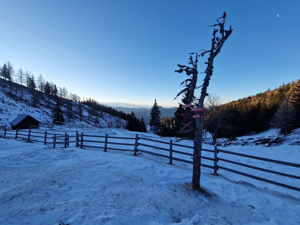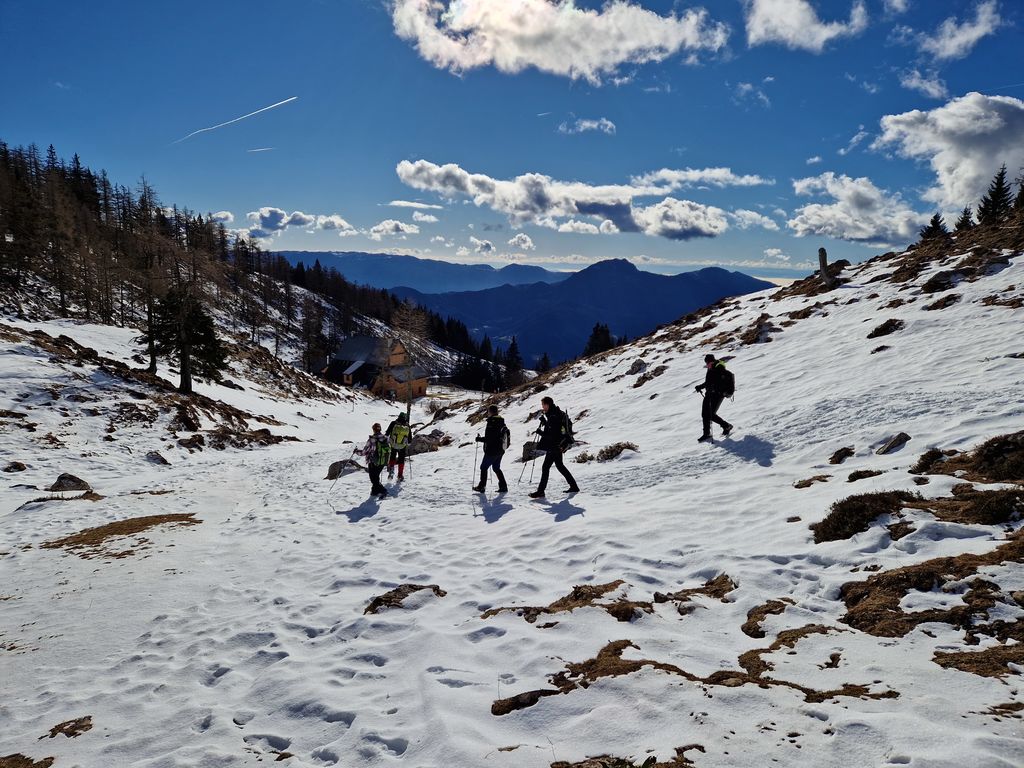 Jutro se je začelo zelo nenavadno, saj smo s Polzele startali v močni dežni plohi. Presenečeni nad nenapovedanimi padavinami smo še enkrat preverili radarsko sliko, ki je obetala čudovit zimski dan. Jeklene konjičke smo parkirali pod kmetijo Radušnik, od koder smo do Koče na Loki potrebovali uro hoda. Malo pod kočo, nekje na višini 1500 metrov, se začne snežna podlaga debeliti in do vrha smo se v zametih kar nekajkrat pogreznili do pasu.