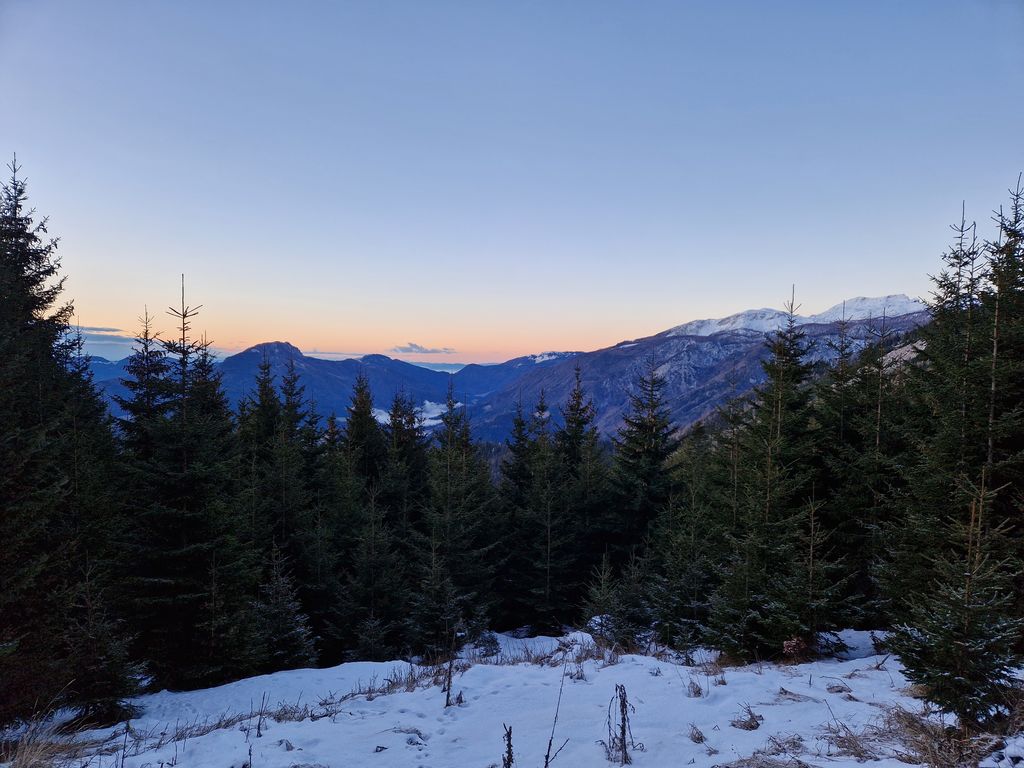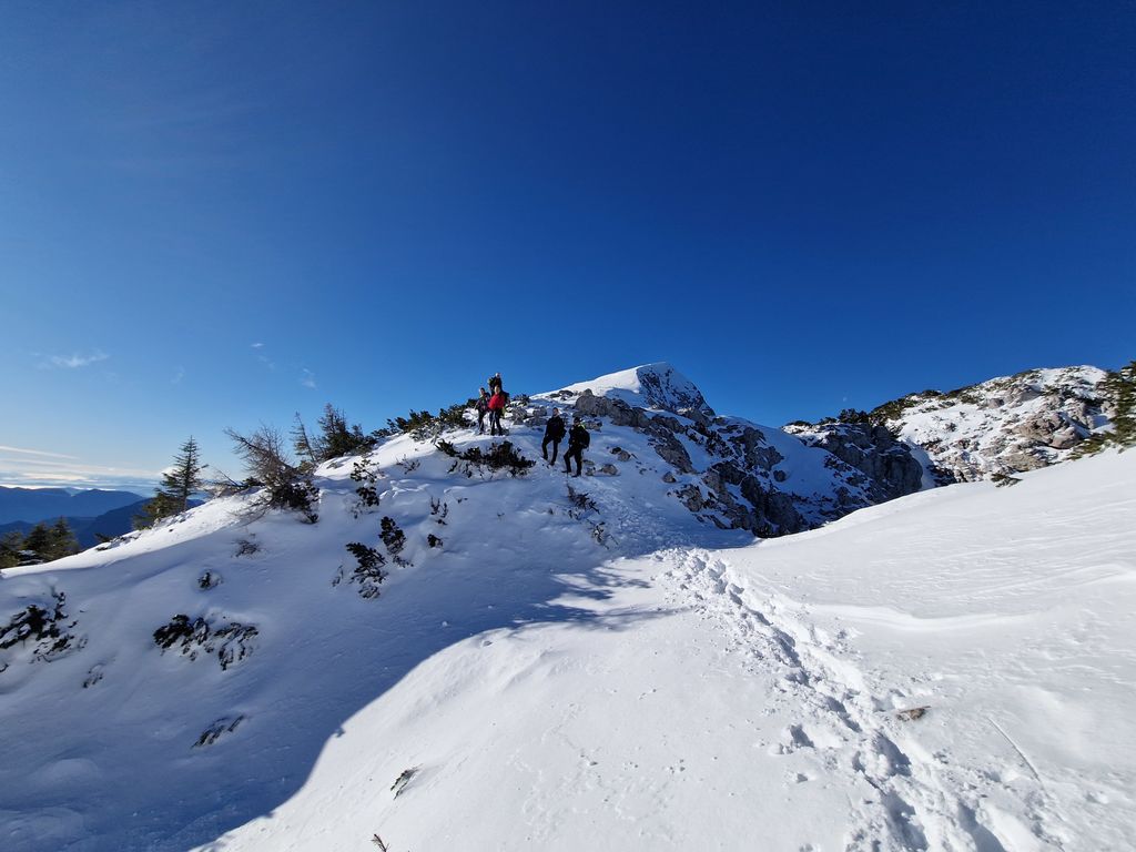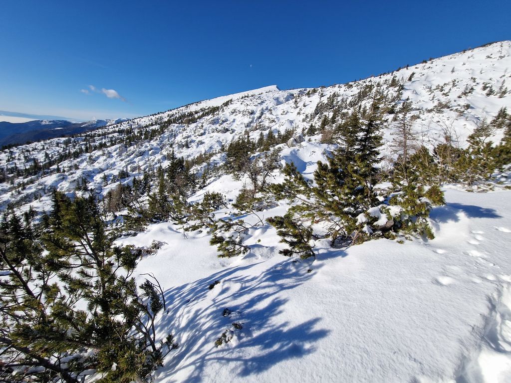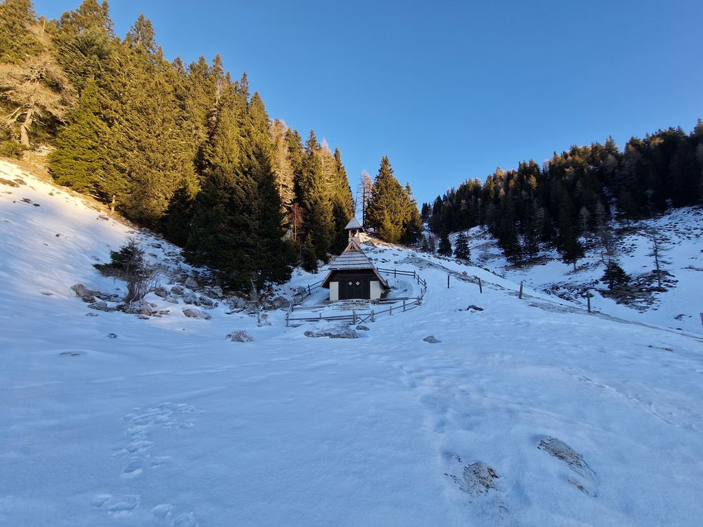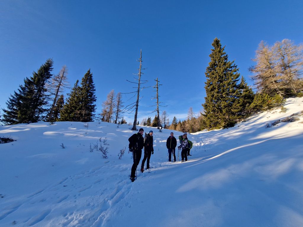 Jutro se je začelo zelo nenavadno, saj smo s Polzele startali v močni dežni plohi. Presenečeni nad nenapovedanimi padavinami smo še enkrat preverili radarsko sliko, ki je obetala čudovit zimski dan. Jeklene konjičke smo parkirali pod kmetijo Radušnik, od koder smo do Koče na Loki potrebovali uro hoda. Malo pod kočo, nekje na višini 1500 metrov, se začne snežna podlaga debeliti in do vrha smo se v zametih kar nekajkrat pogreznili do pasu.