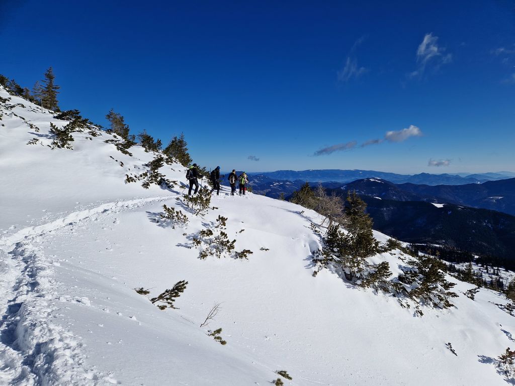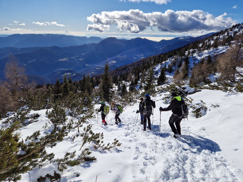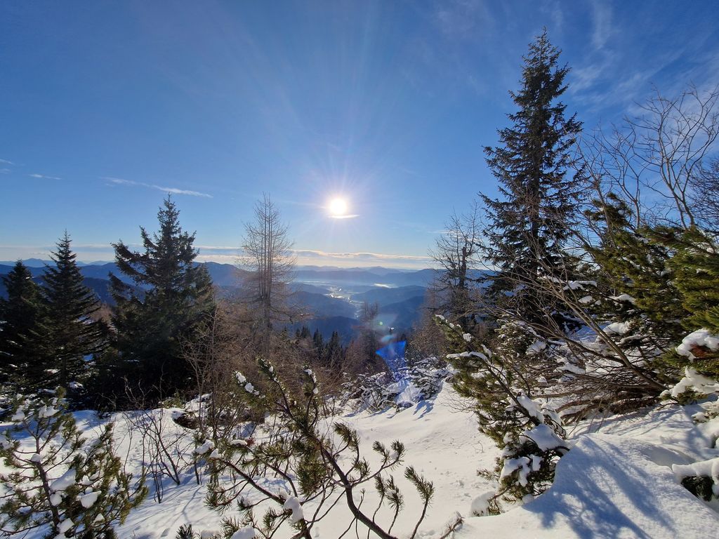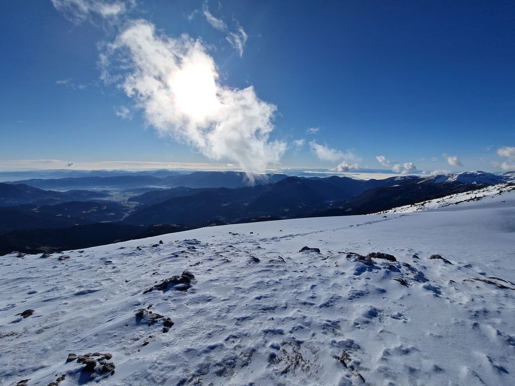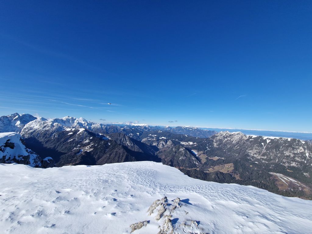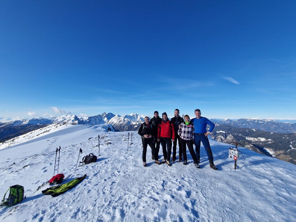 Po jutranjem vremenskem presenečenju smo na vrhu uživali v lepem, toplem in sončnem vremenu s prelepimi razgledi na hribovja daleč onkraj slovenskih meja. Snežna podlaga je resnično skromna, a je bila ravno pravšnja za dričanje. Kot bi mignil, smo bili nazaj pri Koči na Loki, kjer smo si privoščili daljši počitek in martinčkanje na toplem soncu.