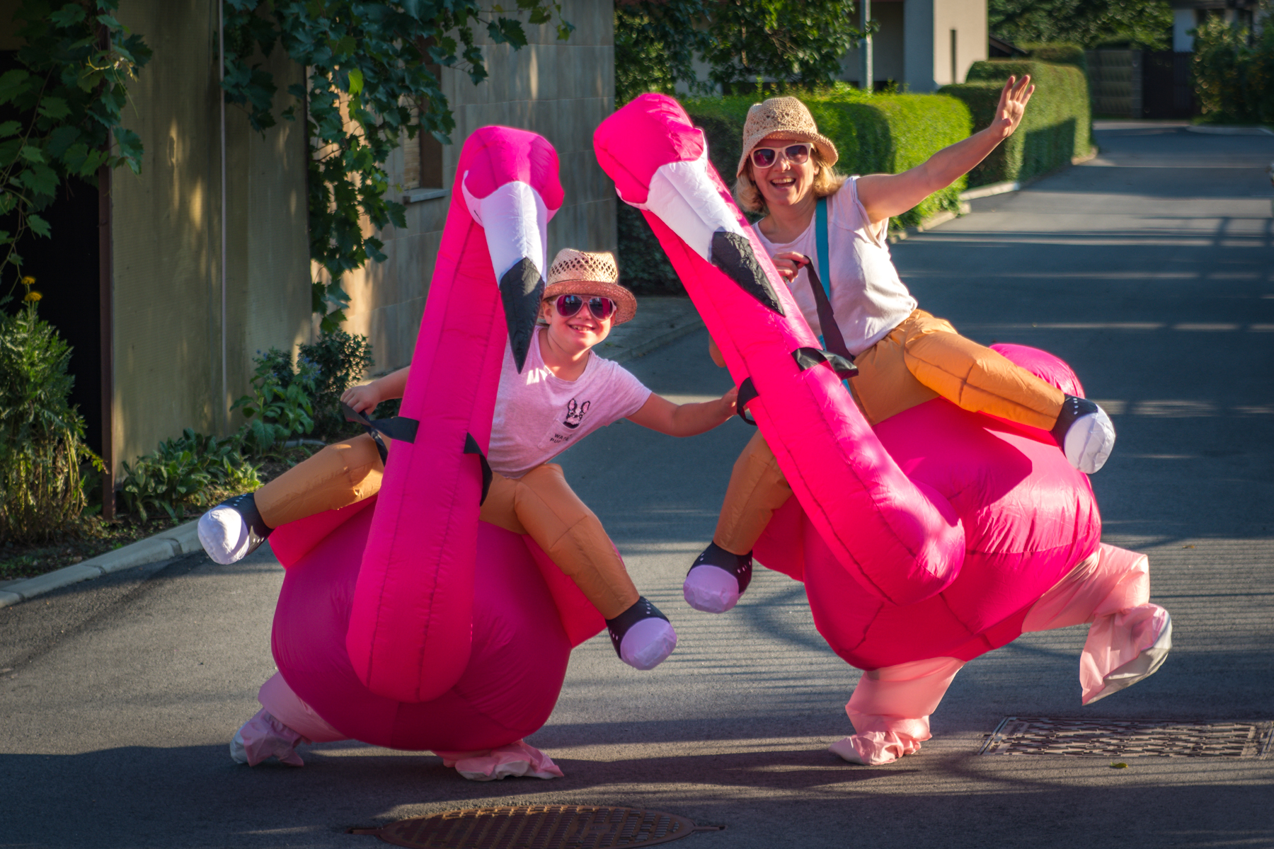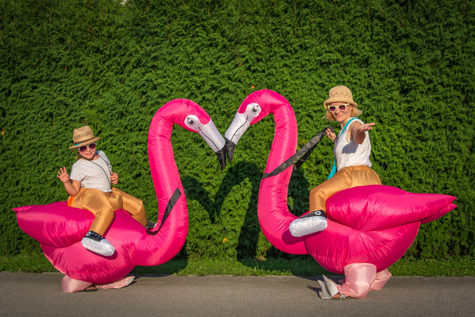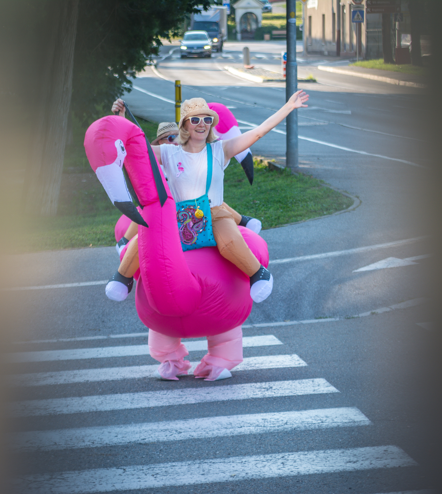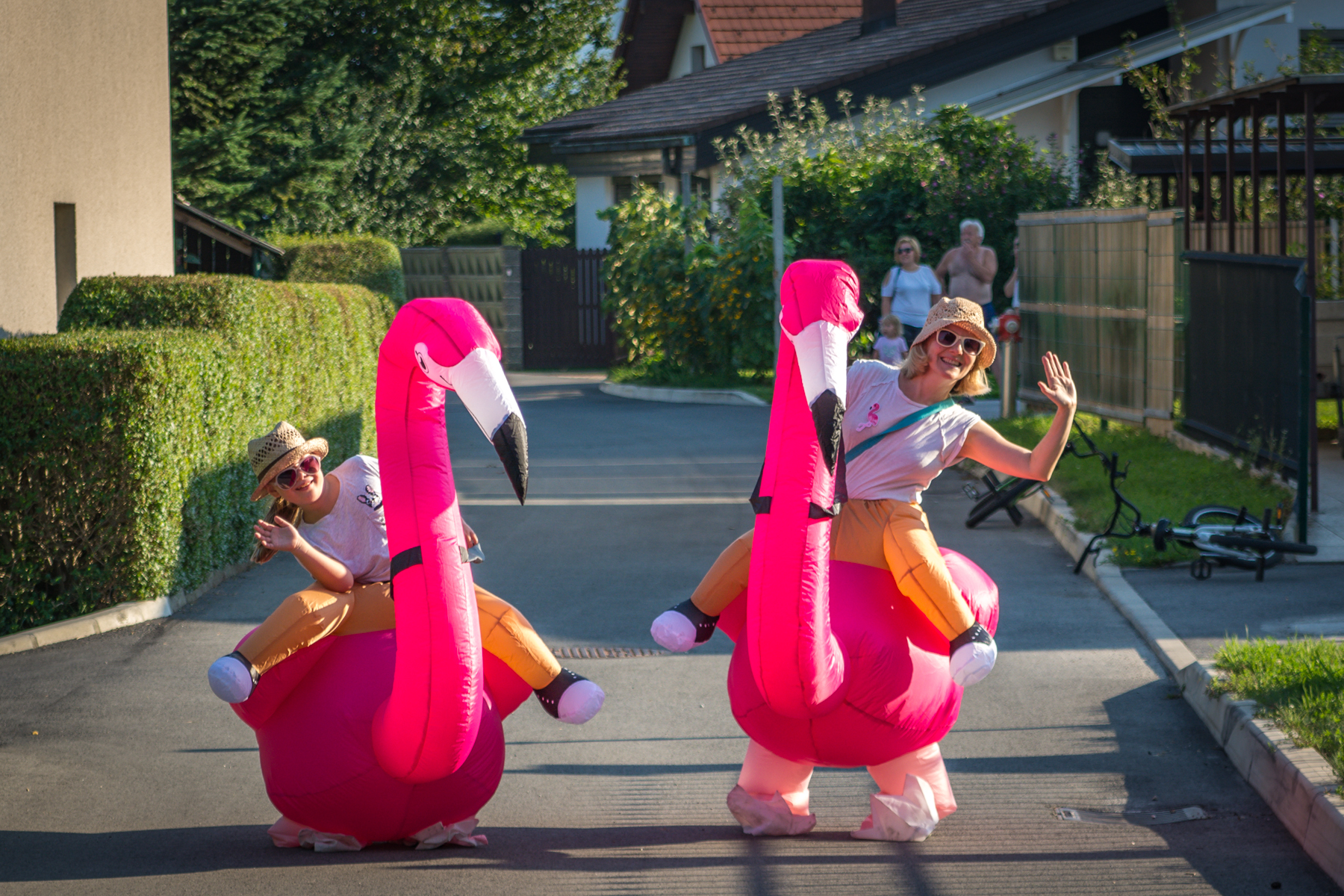 Flamingi spadajo med zelo družabne vrste ptic. Društvo Dobra ideja s Polzele je organiziralo poletni 'walkaround'. Po polzelski promenadi, obarvani s poletnim vzdušjem, sta se sprehajali animatorki Bina Plaznik in Goja Lajlar, napravljeni v par flamingov. Iz zvočnika je igrala glasba in flaminga sta z mimoidočimi tudi zaplesala.