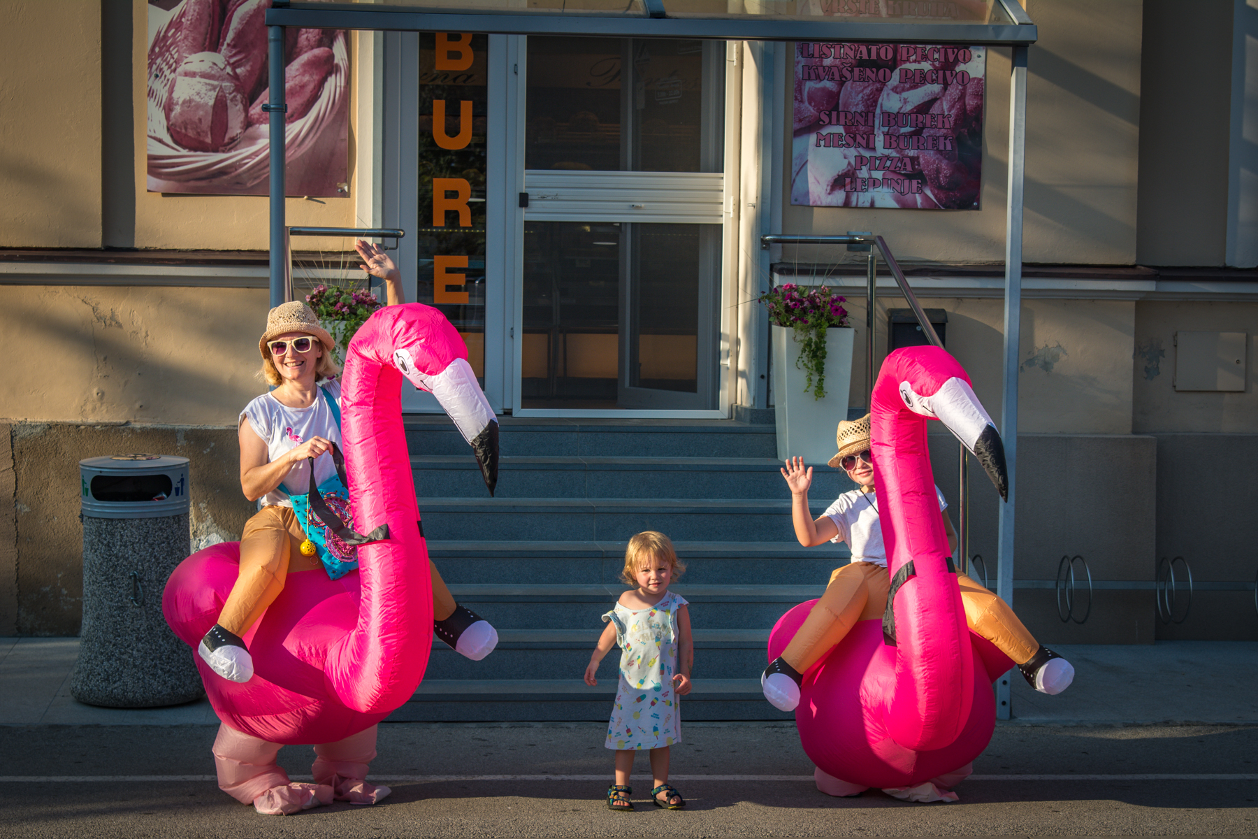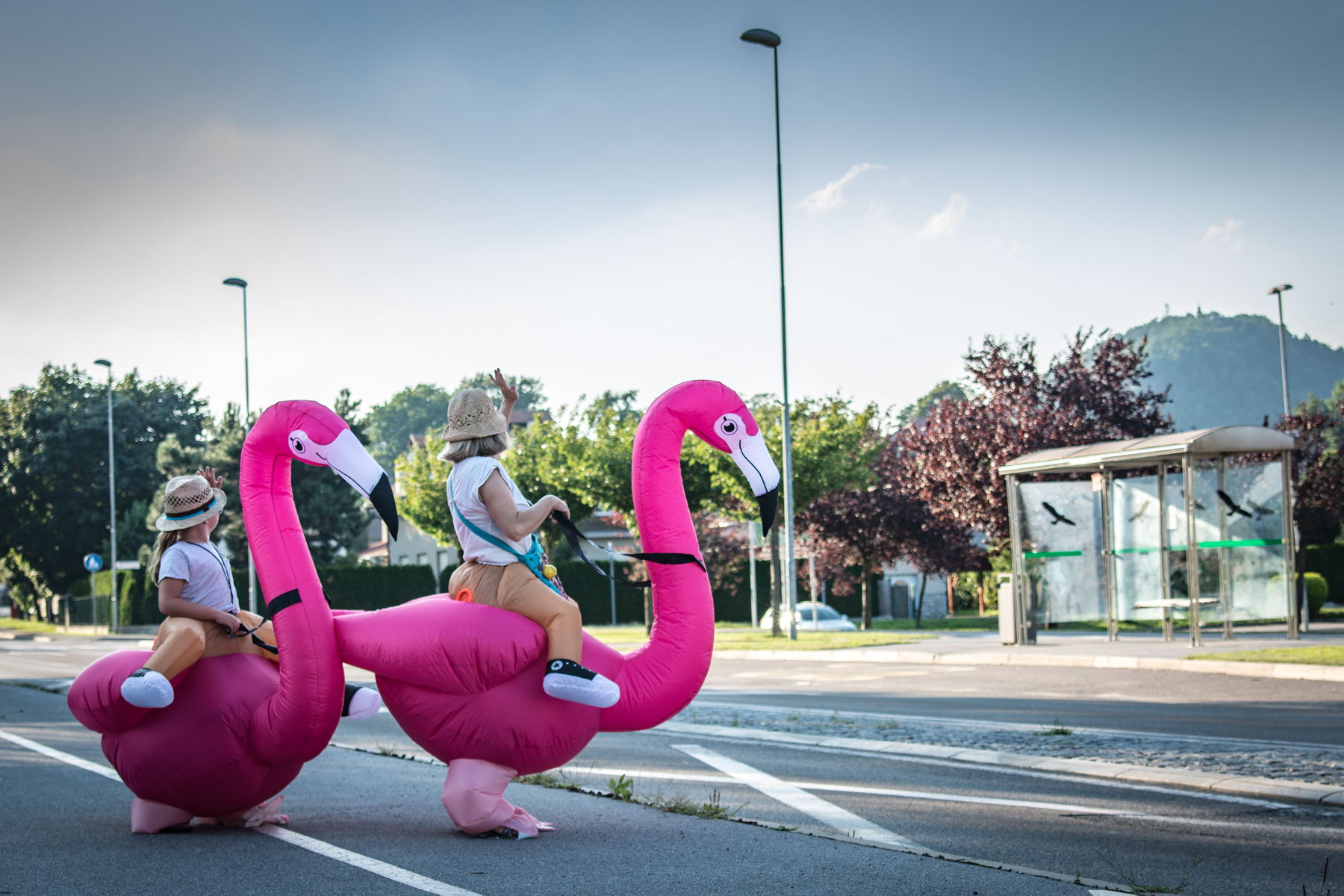Flaminga sta bila na leno, vroče sobotno popoldne prava atrakcija za mimoidoče. Mimovozeči so veselo trobili, mahali in fotografirali iz avtomobilov. Marsikdo od mimoidočih je od daleč fotografiral in se nasmihal ob rožnatih pojavah, nekateri otroci pa so se opogumili in se fotografirali s plešočima flamingoma za spomin na zabavno srečanje. Ljudem sta animatorki ustvarili iskrico v popoldnevu in zgodbo za pripovedovanje.