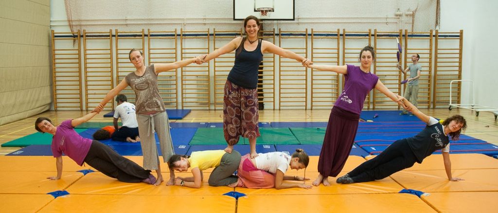 z osnovami akrobacij (skupinske piramide, stoje na rokah, kolesa …)