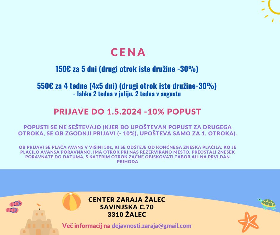 150 € za 5 dni (drugi otrok iste družine -30 %)