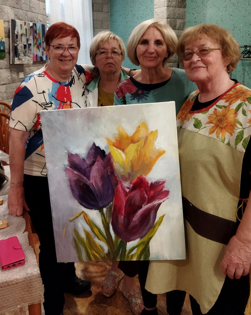 Štiri članice likovne sekcije KUD Polzela (Franica Šporn, Marija Studnička, Sonja Jezernik in Mojca Korošec) so v Izoli naslikale še skupinsko sliko za Društvo upokojencev Polzela in jo izročile v zahvalo za spodbudo in sodelovanje predsedniku Igorju Pungartniku.