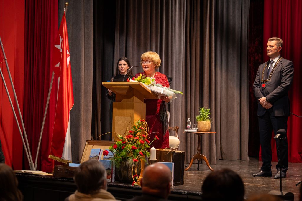Dobitnico Prešernovega cekina, slikarko in likovno vzgojiteljico Mojco Korošec, je temeljito predstavila povezovalka programa Živa Avžner. Poudarila je, kaj vse je prejemnica visokega priznanja prispevala na področju likovnega ustvarjanja, postavljanja razstav in izobraževanja mladih likovnikov v polzelski občini.