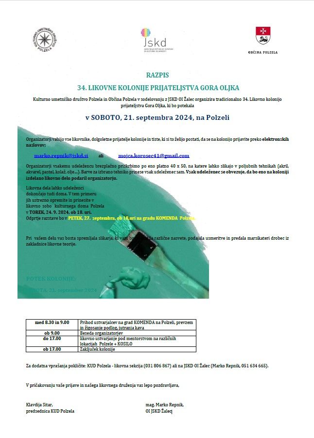 Kulturno umetniško društvo Polzela in Občina Polzela v sodelovanju z JSKD OI Žalec organizira tradicionalno 34. Likovno kolonijo prijateljstva Gora Oljka, ki bo potekala