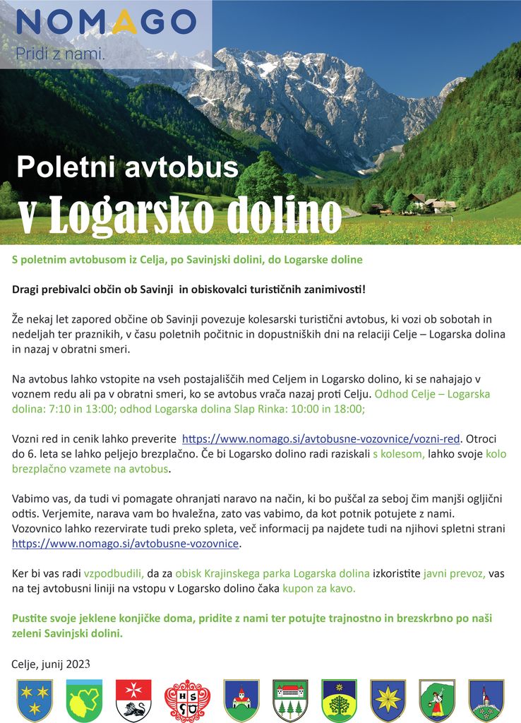 Vozni red in cenik lahko preverite na spletni povezavi https://www.nomago.si/avtobusne-vozovnice/vozni-red. Otroci do 6. leta se lahko peljejo brezplačno. Če bi Logarsko dolino radi raziskali s kolesom, lahko svoje kolo brezplačno vzamete na avtobus. Vabimo vas, da tudi vi pomagate ohranjati naravo na način, ki bo puščal za seboj čim manjši ogljični odtis. Verjemite, narava vam bo hvaležna, zato vas vabimo, da kot potnik potujete z nami. Vozovnico si lahko rezervirate tudi prek spleta, več informacij najdete na spletni strani https://www.nomago.si/avtobusne-vozovnice.