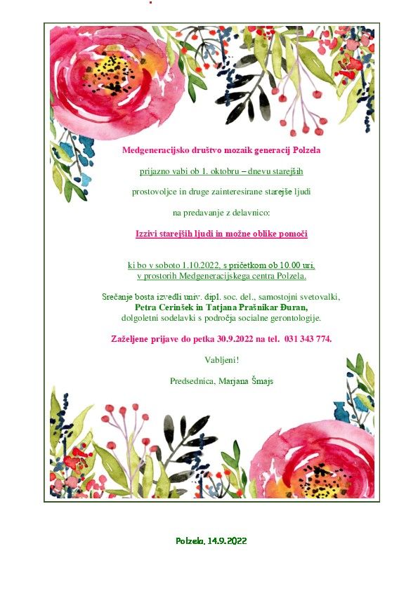 ki bo v soboto 1. 10. 2022, s pričetkom ob 10.00 uri, v prostorih Medgeneracijskega centra Polzela.