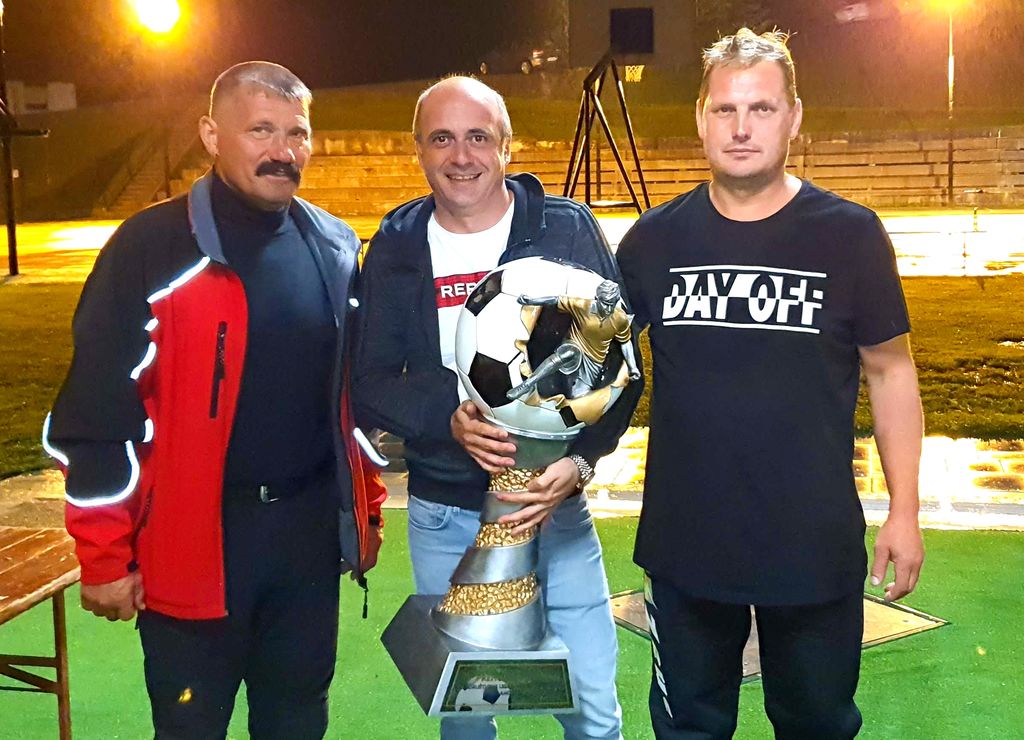 Na sliki Od leve proti desni: predsednik ŠD Andraž nad Polzelo Simon Ograjenšek, predstavnik zmagovalne ekipe Kormorani - Casata Demiri Lavdrim, ki v rokah drži prehodni pokal, ter organizator lige Anton Brunšek.