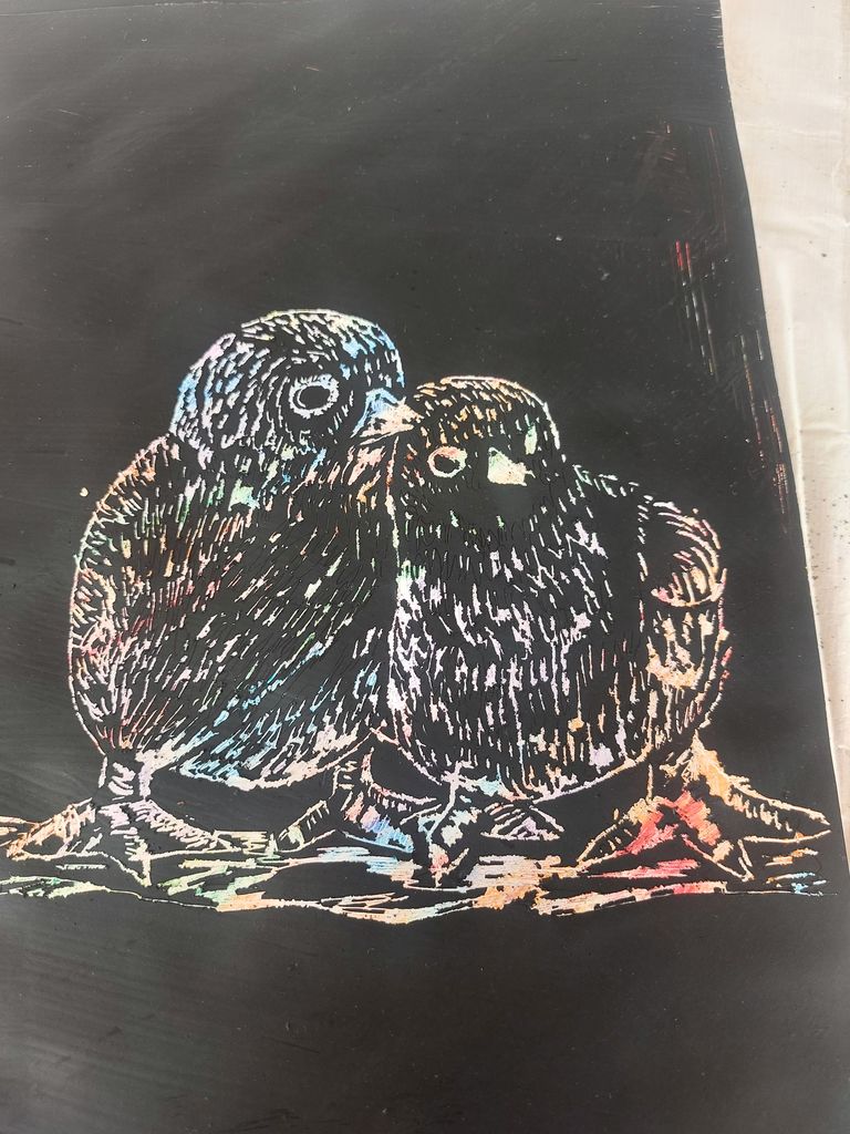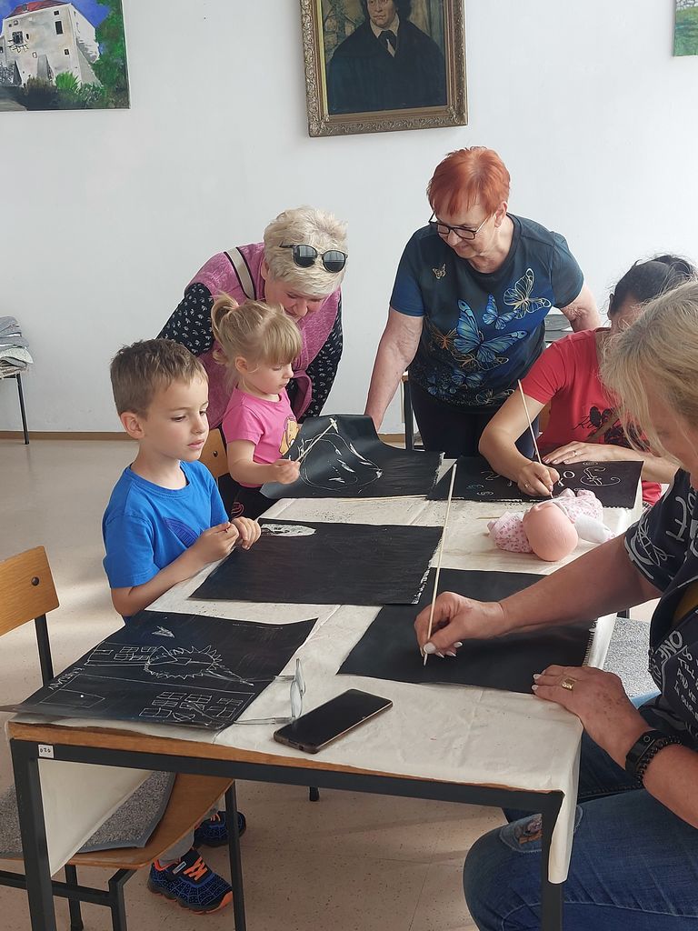 Prva delavnica je potekala v torek, 27. maja 2025, v Kulturnem domu Polzela, saj muhasto vreme ni dopuščalo ustvarjanja na gradu Komenda. Mladi obiskovalci so radovedno in z velikim zanimanjem prisluhnili razlagi uporabe flomastrov, vodenih barvic in voščenk. Izvedeli so, kakšna podlaga je najprimernejša, da nastane prava ali ponarejena praskanka. Zagnano so se lotili dela in v kratkem času izdelali zanimive slike, ki jih bodo pokazali na skupinski razstavi.