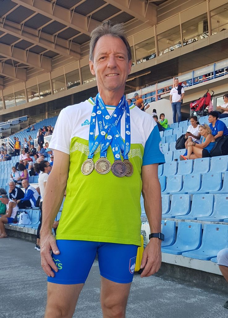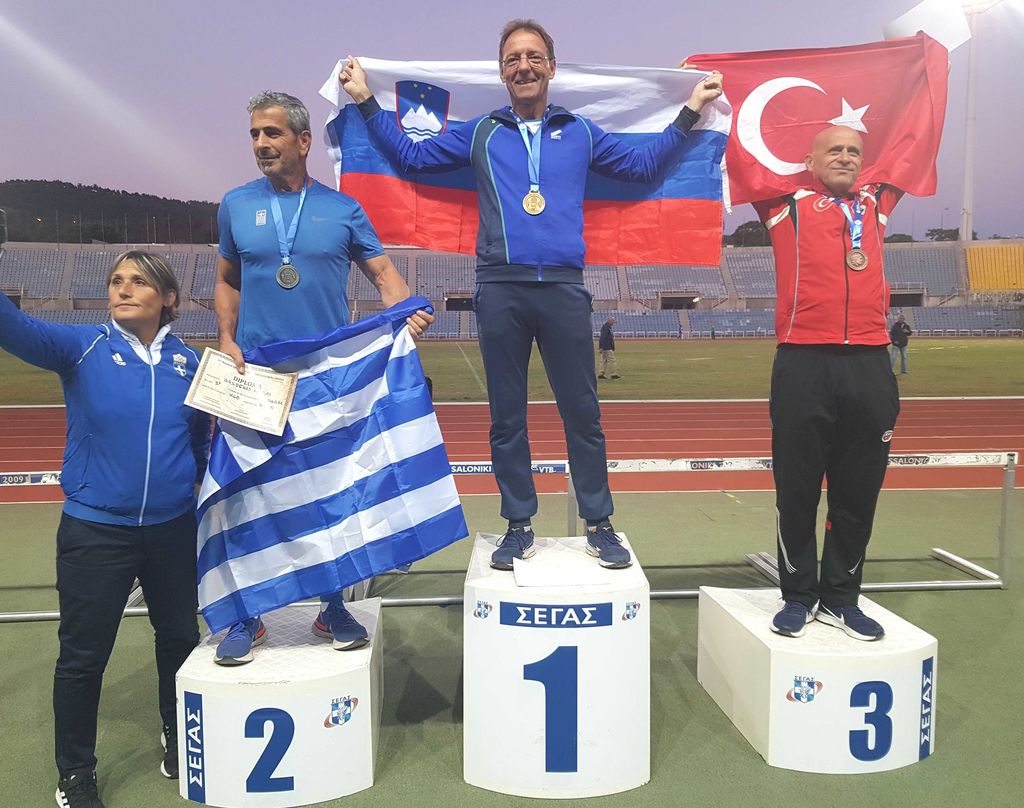 Marko Božiček je odlično nastopil v svoji kategoriji M 60 in osvojil kar tri zlate kolajne, in sicer na 300 metrov z ovirami, 100 metrov z ovirami in v teku na 400 metrov, tej beri pa je dodal še bron v teku na 200 metrov.