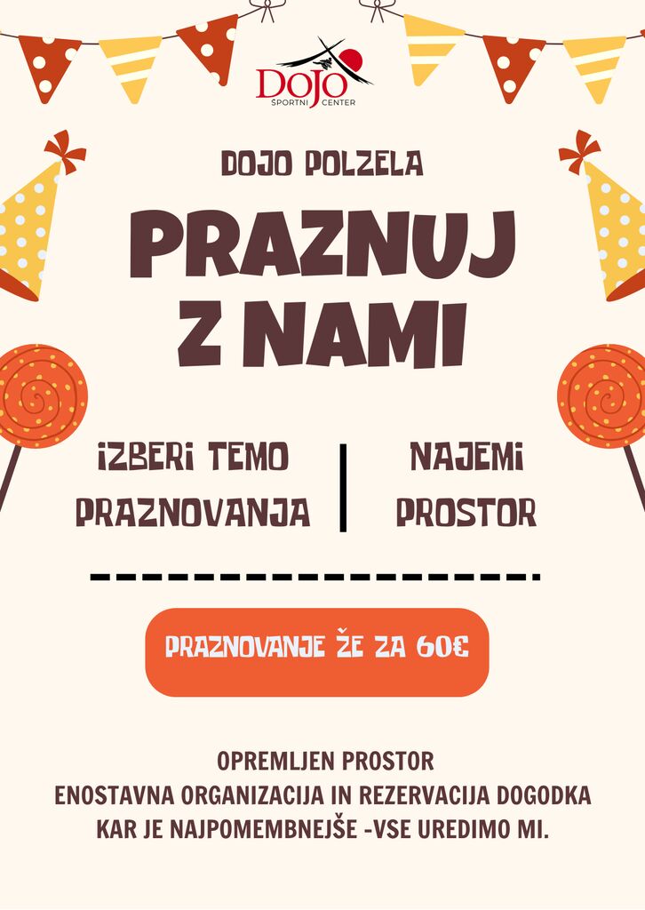• V ceno vsakega paketa so vključeni: vabilo, fotografiranje, prigrizki in pijača, animatorki, brezplačni trening karateja (en mesec).