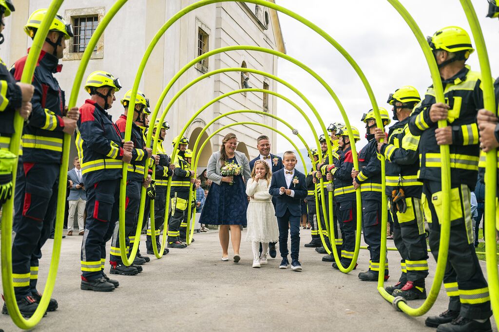 Ob izhodu iz cerkve ju je pričakala čudovita gasilska dobrodošlica: slavolok iz cevi, ki so ga postavili člani domačega gasilskega društva ter gasilci iz sosednjih društev Polzele in Andraža nad Polzelo. Mladoporočenca sta se nasmejana in ganjena sprehodila skozi simbolični lok, kar je še dodatno poudarilo povezanost njune družine z gasilstvom.